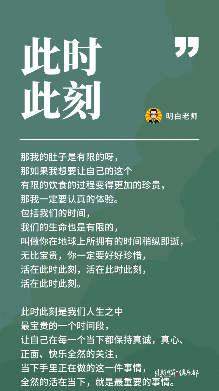 此时此刻是我们人生之中最宝贵的一个时间段,让自己在每一个当下都保持真诚,真心、正面、快乐全然的关注,当下手里正在做的这一件事情,正在看到的一些物品,正在经历的一些情绪,全然的活在当下,就是最重要的事情。