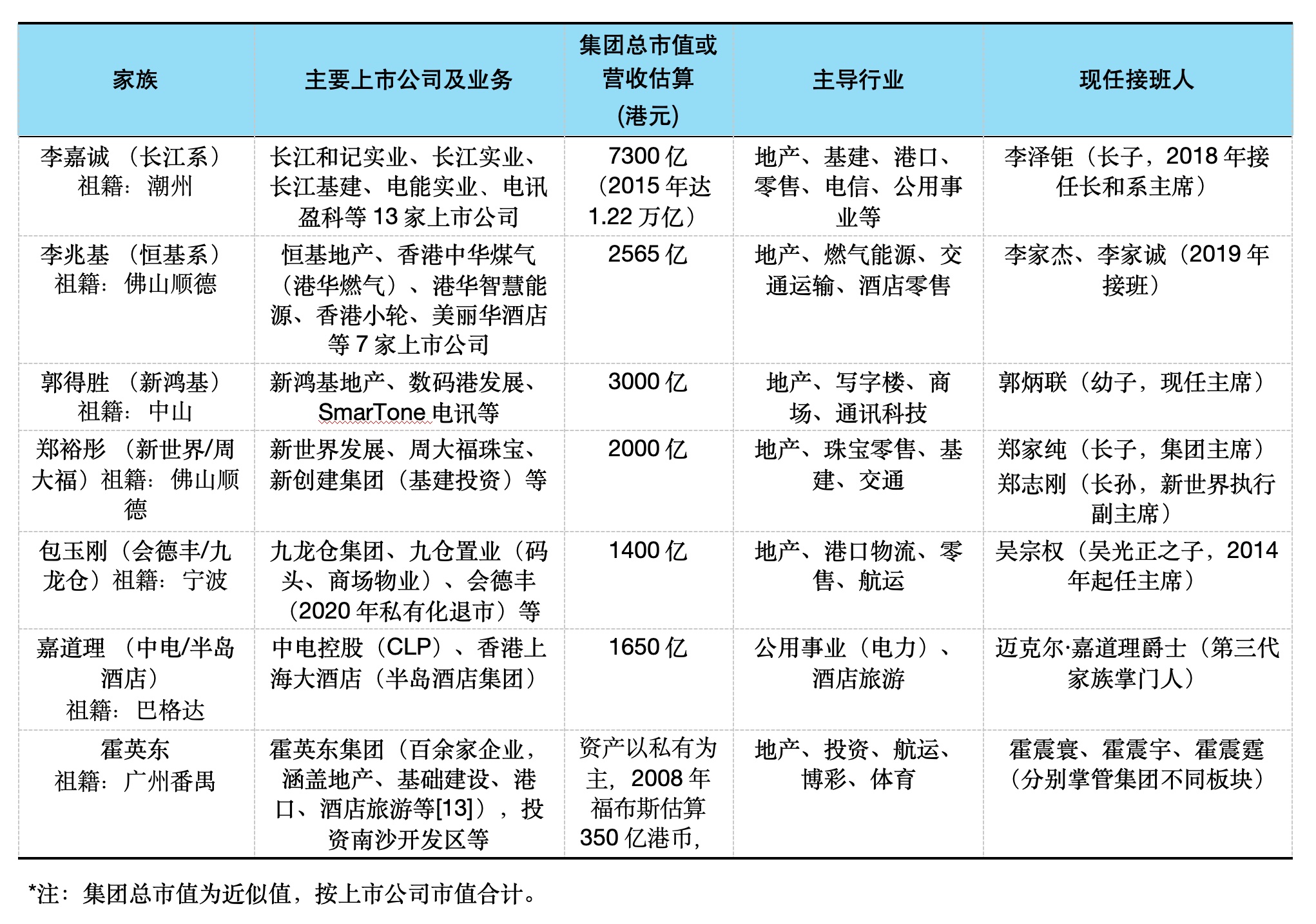 - 七大家族源于房地产、公共事业,映射香港经济由制造业转向地产、金融服务业的变迁,以及内地经济快速发展给香港企业带来巨大推力。