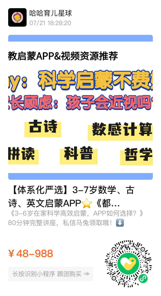 【加入0-6岁、6-10岁亲子教育社群】【领取10万字启蒙攻略&300G网盘资源】
