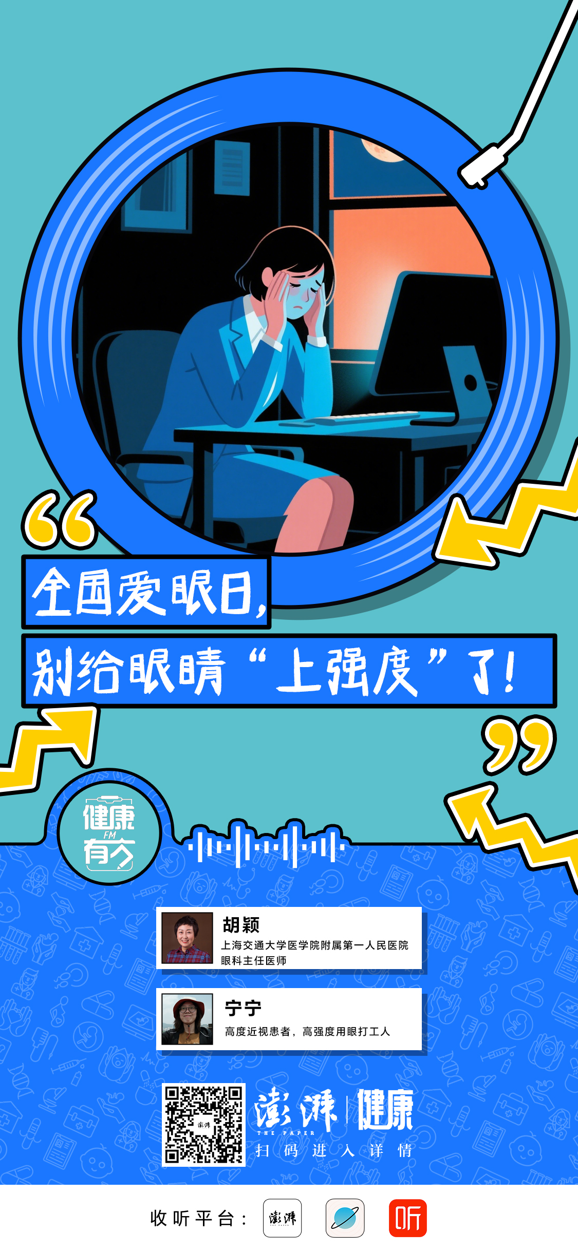 如今,电子屏幕已和我们的生活“强绑定”,到点下班后,眼睛还得超负荷劳作。我们该如何给双眼“减负”?近视手术是否只能短期解决问题,不能一劳永逸?本期《健康有方FM》邀请上海市第一人民医院眼科主任医师胡颖、以及纠结是否要去做近视手术的上班族宁宁展开探讨。