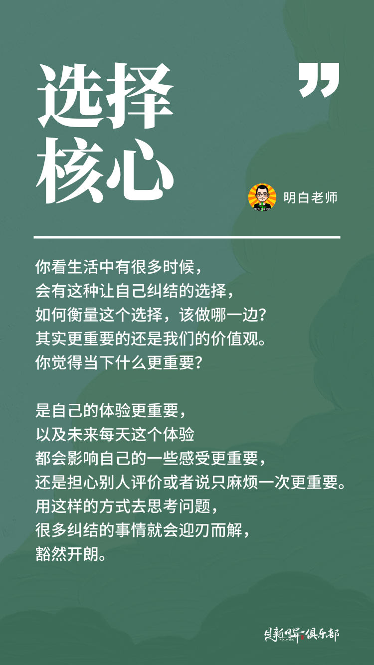 你看生活中有很多时候,会有这种让自己纠结的选择,如何衡量这个选择,该做哪一边?其实更重要的还是我们的价值观。你觉得当下什么更重要?是自己的体验更重要,以及未来每天这个体验都会影响自己的一些感受更重要,还是担心别人评价或者说只麻烦一次更重要。用这样的方式去思考问题,很多纠结的事情就会迎刃而解,豁然开朗。