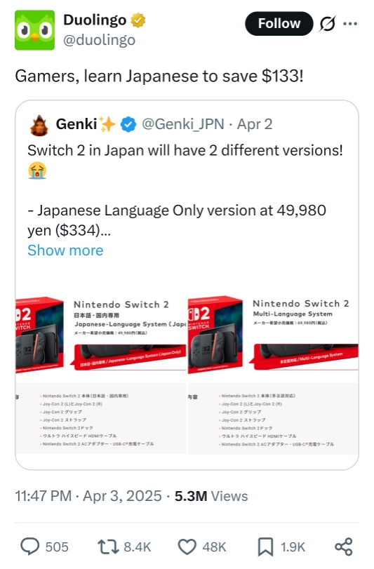③但没想到臭鸟你也来嘚瑟几句(游戏玩家们,学日语可以省下133美元),不过这条转发还是发早了,你没算关税战的影响呢→_→