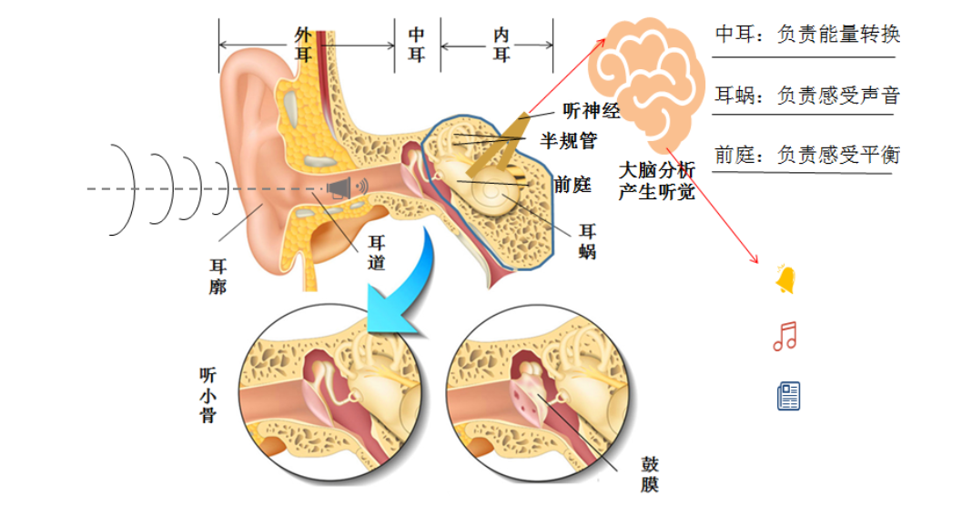 我们的耳朵,可以简单分成三个部分,外耳、中耳和内耳。外耳就像是一个声音收集器,咱们能看到的耳朵形状,也就是耳廓,它负责把外界的声音收集起来,然后通过外耳道,将声音传递到中耳。中耳有一个非常重要的结构,就是鼓膜。当声音传到鼓膜的时候,鼓膜就会随着声音的振动而振动。鼓膜的后面,连着听小骨,听小骨有三块,它们像一个接力棒一样,把鼓膜的振动进一步放大,传递到内耳。内耳里有一个像蜗牛壳一样的结构,叫做耳蜗。耳蜗里面充满了液体,还有很多非常敏感的毛细胞。当听小骨传来的振动让耳蜗里的液体也跟着振动起来的时候,这些毛细胞就会受到刺激,把这种机械振动转化成电信号,通过听觉神经传递到大脑,这样,我们的大脑就能 “听” 到声音啦!