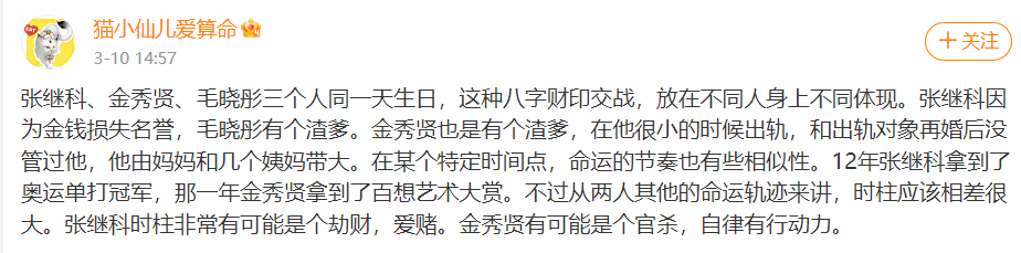 朋友发给了我一个微博,里面说到张继科、金秀贤、毛晓彤他们三个出生于同一天!而且获奖的时间都有交集。但是毛晓彤和金秀贤的父母都离异了,而张继科出生于一个富裕的家庭。三个人的人生轨迹也相差甚远!