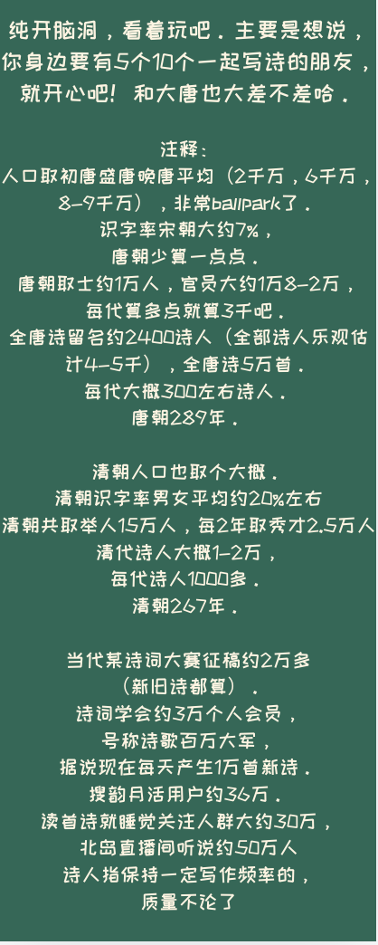 主要是想说,唐朝诗人朋友圈里也没几个人。今天,你如果有3-5个朋友能一起唱和,或者10几20几人一起谈谈诗,已经很不错了。和唐朝人差不多:)
