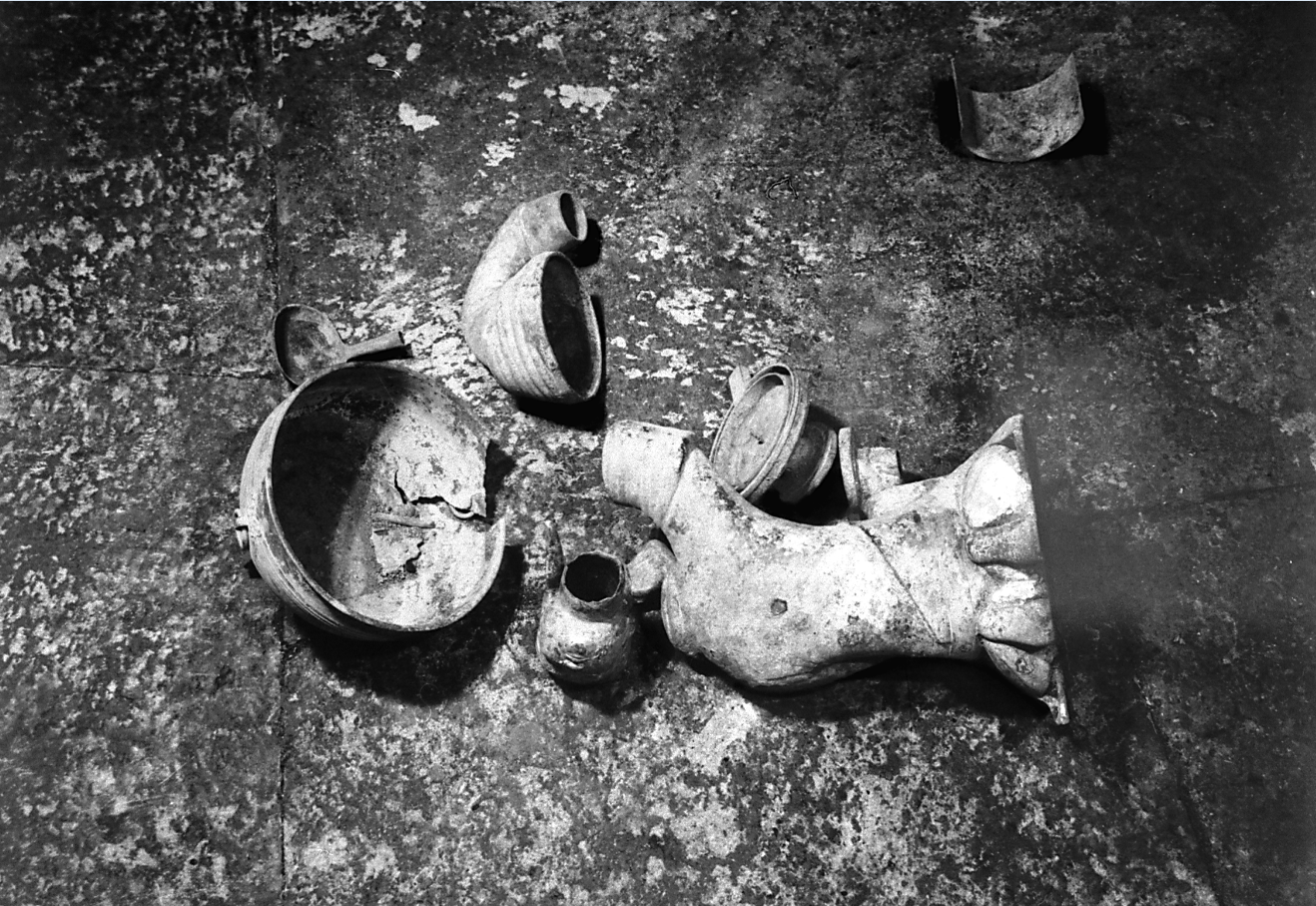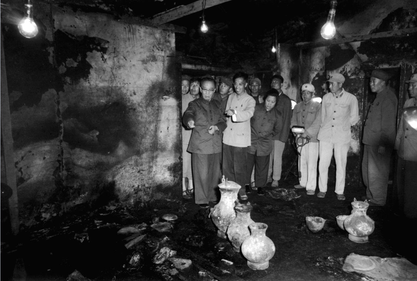郭沫若院长(前左一)参观一号墓主室出土的青铜器(前左二为作者)