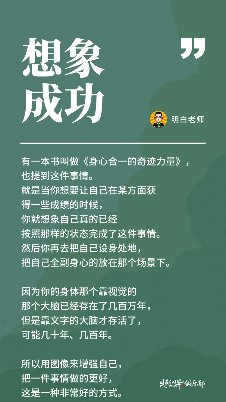 再比如你去运动,你去学一个东西,让理想的自己是什么样做的,就把那个画面想象出来。这时候当你再去行动的时候,你就会非常的顺利丝滑。因为你的身体那个靠视觉的那个大脑已经存在了几百万年,但是靠文字的大脑才存活了,可能几十年、几百年。