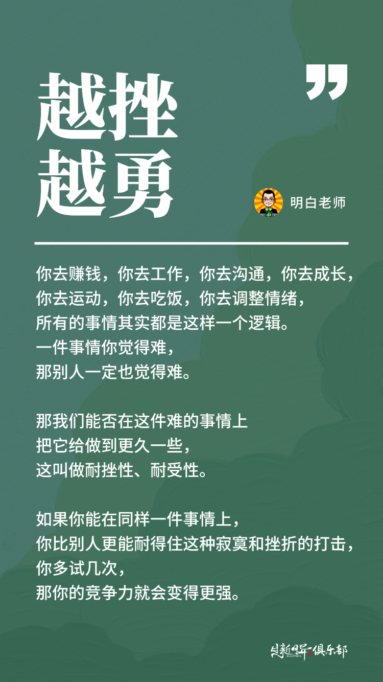 当然我们这里是拿读书来举例,但是你去赚钱,你去工作,你去沟通,你去成长,你去运动,你去吃饭,你去调整情绪,所有的事情其实都是这样一个逻辑。一件事情你觉得难,那别人一定也觉得难。那我们能否在这件难的事情上把它给做到更久一些,这叫做耐挫性、耐受性。