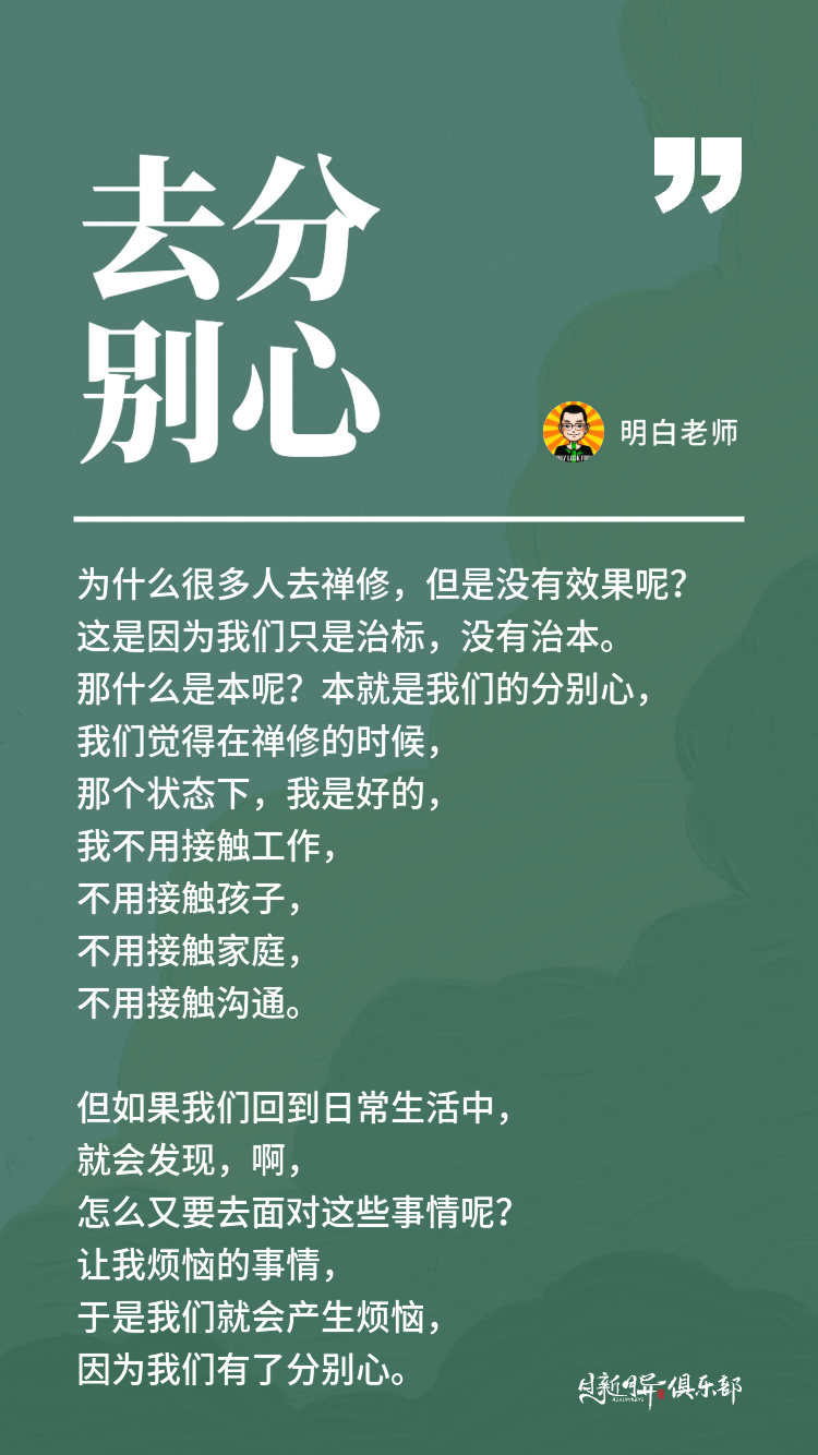 这是因为我们只是治标,没有治本。那什么是本呢?本就是我们的分别心,我们觉得在禅修的时候,那个状态下,我是好的,我不用接触工作,不用接触孩子,不用接触家庭,不用接触沟通。
