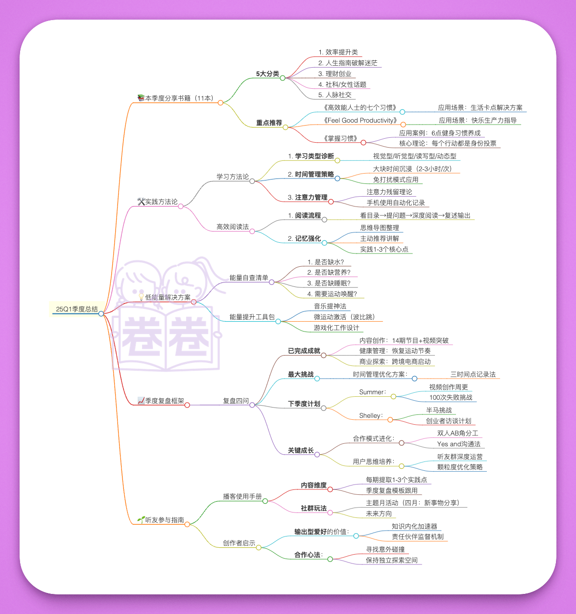 Hello朋友们,欢迎回到卷卷姐妹🎧!这期是我们第一次的25Q1季度总结,我们回顾了过去3个月共读的11本书,也真诚地和你盘点——哪些知识点真的帮我们解决了生活与工作中的具体问题,哪些方法落地有效、值得反复实践。这一集,不只是复盘,更像一次深度“脑内整理”和行动对账单💼。我们结合效率提升、人生选择、理财创业、社交沟通四大主题,拆解出最打动我们的书和tips,告诉你哪些内容我们已经用了、怎么用的、效果如何。