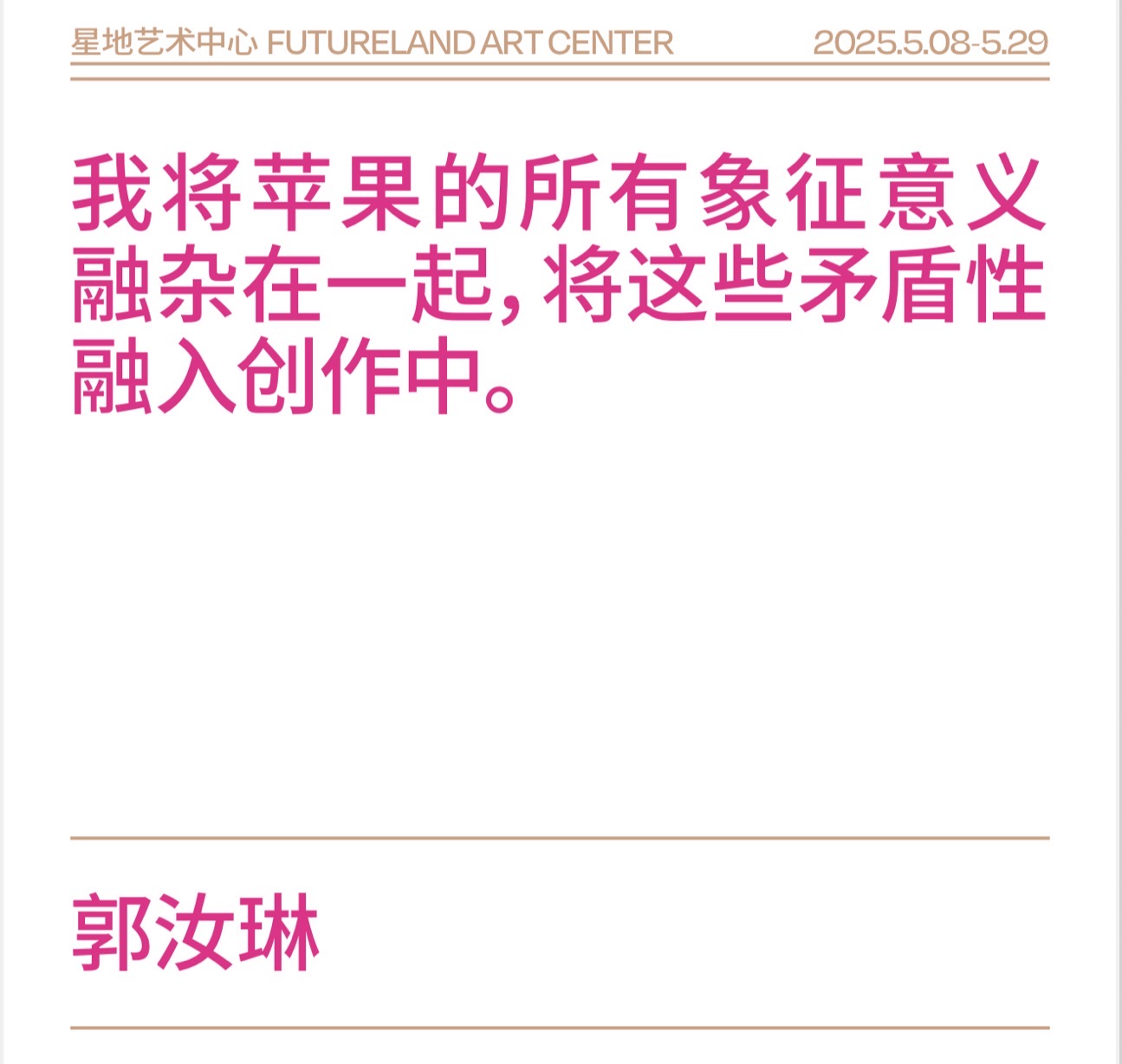 郭汝琳,硕士毕业于天津美术学院综合艺术专业,其创作围绕着社会生态观察与个体生命经验的交织展开,聚焦于女性生存境遇、边缘群体叙事以及民俗文化与现代性碰撞等议题。在其艺术实践中,艺术家建构了一套以"苹果"为核心意象的跨媒介叙事体系。通过架上绘画的平面性表达、陶瓷艺术的物质转化性以及纸浆艺术的触觉质感等综合材料的并置与对话,实现对这一日常物象的符号学解构与重构。