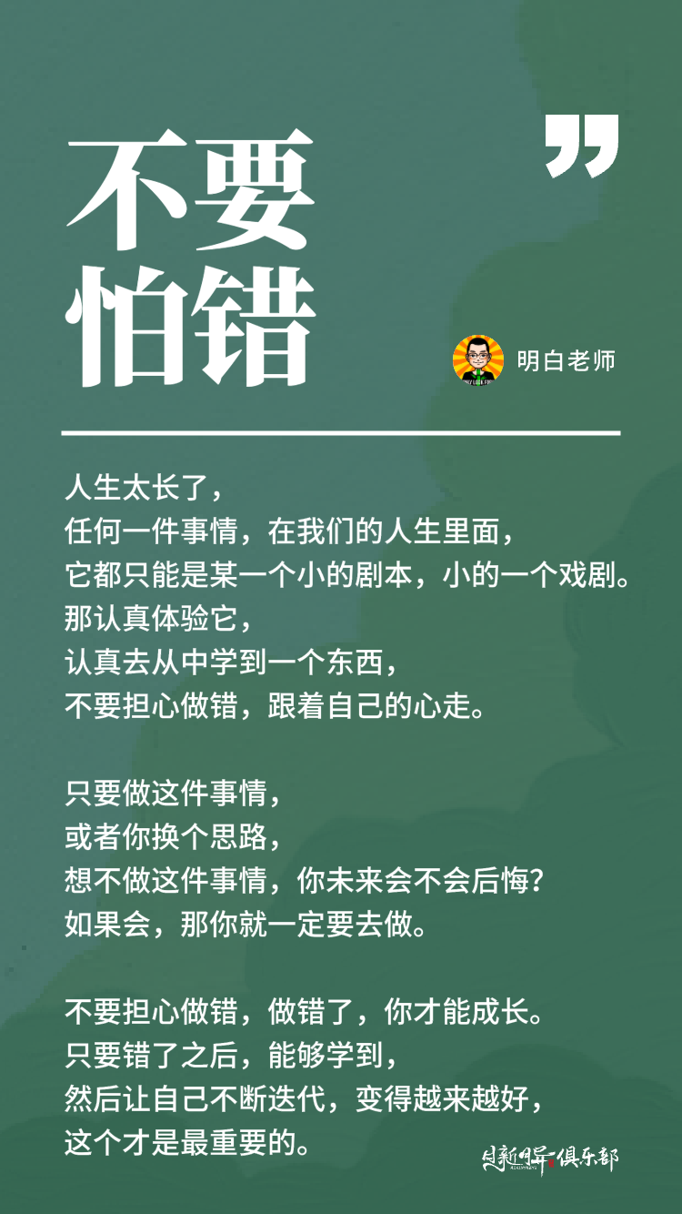 那认真体验它,认真去从中学到一个东西,不要担心做错,跟着自己的心走,只要做这件事情,或者你换个思路,想不做这件事情,你未来会不会后悔?如果会,那你就一定要去做,不要担心做错,做错了,你才能成长。只要错了之后,能够学到,然后让自己不断迭代,变得越来越好,这个才是最重要的。