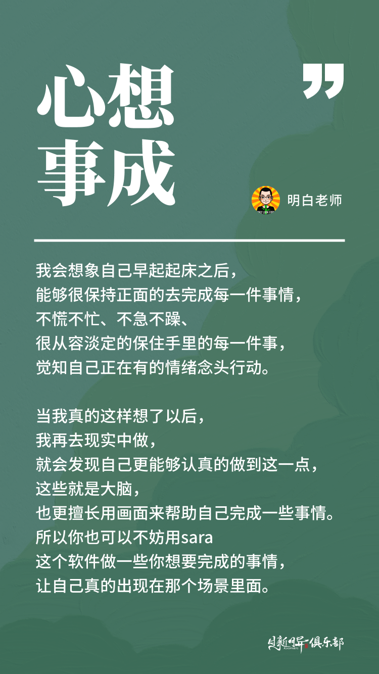 当我真的这样想了以后,我再去现实中做,就会发现自己更能够认真的做到这一点,这些就是大脑,也更擅长用画面来帮助自己完成一些事情。所以你也可以不妨用sara这个软件做一些你想要完成的事情,让自己真的出现在那个场景里面。