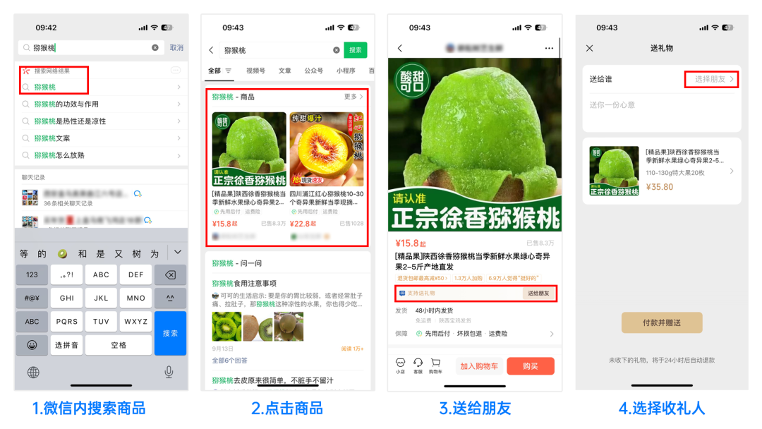 微信:与社交场景融合紧密,在微信搜商品,点 “送给朋友”,确定规格、留言、付款后,以蓝包形式发送。收礼人在聊天框点击消息填地址即可领取,操作简便。
