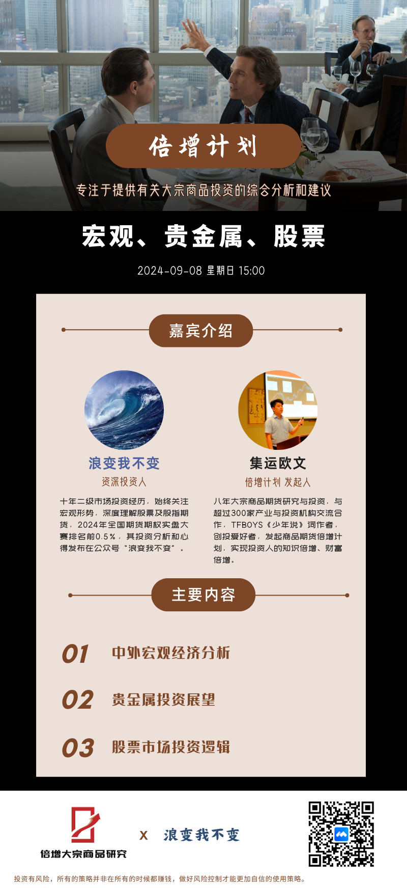 嘉宾:浪变我不变,资深投资人,十年二级市场投资经历,始终关注宏观形势,深度理解股票及股指期货,2024年全国期货期权实盘大赛排名前0.5%,其投资分析和心得发布在公众号“浪变我不变”。