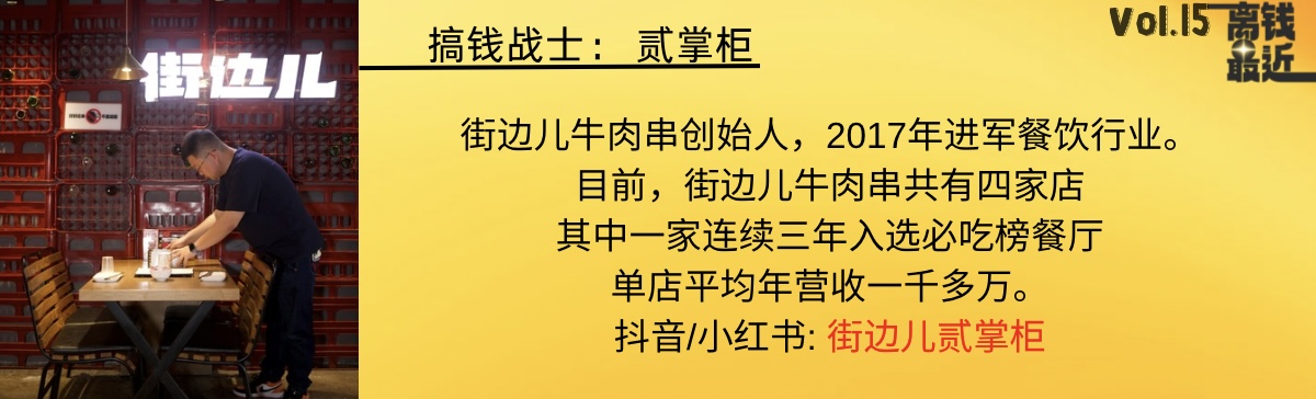 但贰掌柜却认为自己不算成功,入行8年,他“越做越敬畏”。消费下行,餐饮行业早已过了躺赚阶段。街边儿牛肉串能够存活至今成为网红店,比起如何赚钱,他认为先读懂亏钱避坑指南更重要。