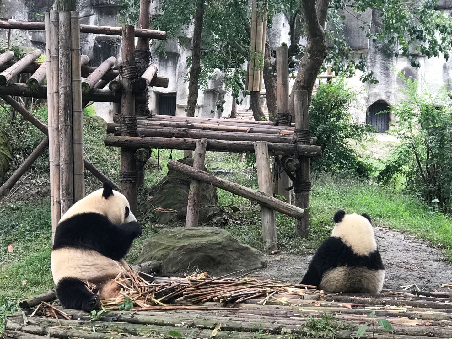 在成都的熊猫基地,一群游客目睹了三只熊猫的爬树行为,其中一只爬到了约七八米高的树上,引得游客们既惊叹又担心。游客们对熊猫的悠闲姿态和可能的危险进行了讨论,同时对熊猫之间的互动表达了好奇和幽默的解读,最后建议更换观察位置以获得更好的视角。