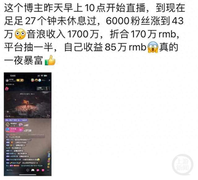 一张截图在网上流传,内容是某游戏主播从20日上午10点《黑神话:悟空》上线时开始直播,连续直播27小时(也有媒体称是30多小时),涨粉43万,获得打赏170万元,他本人获得约85万元分成。典型的听天命~