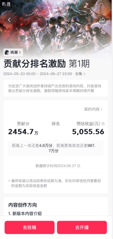 渊维在直播鸣潮的一些数据,鸣潮的排名积分 鸣潮直播框架分成规则 为了隐私,去掉了主播名字与排名;