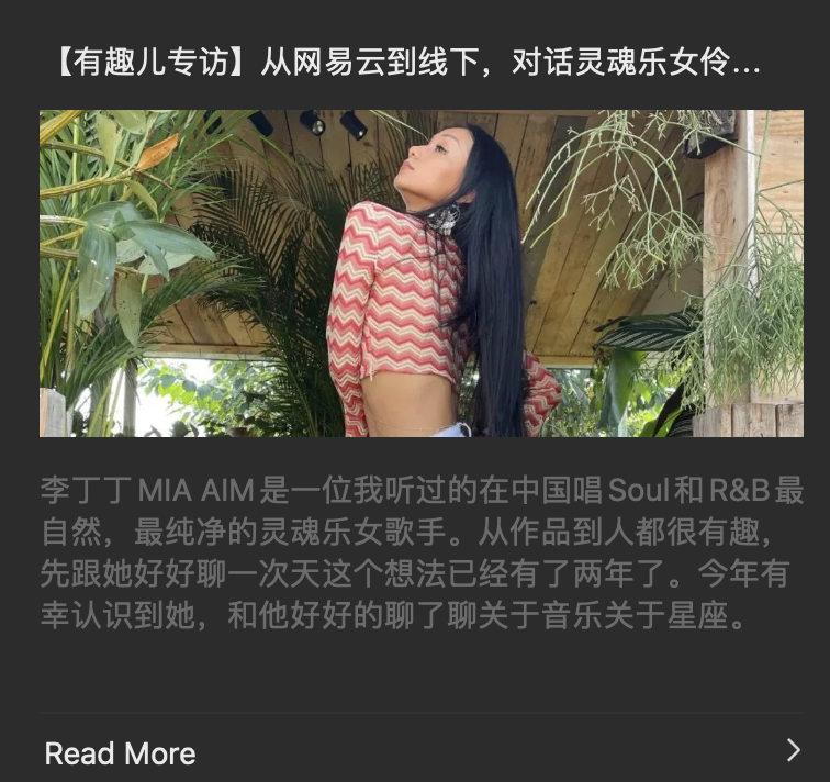 李丁丁MIA AIM是一位我听过的在中国唱Soul和R&B最自然,最纯净的灵魂乐女歌手。从作品到人都很有趣。分享一下去年和她的电话采访聊天,剪出一期播客,一起来听听她的音乐灵感和谁影响了她的音乐。
