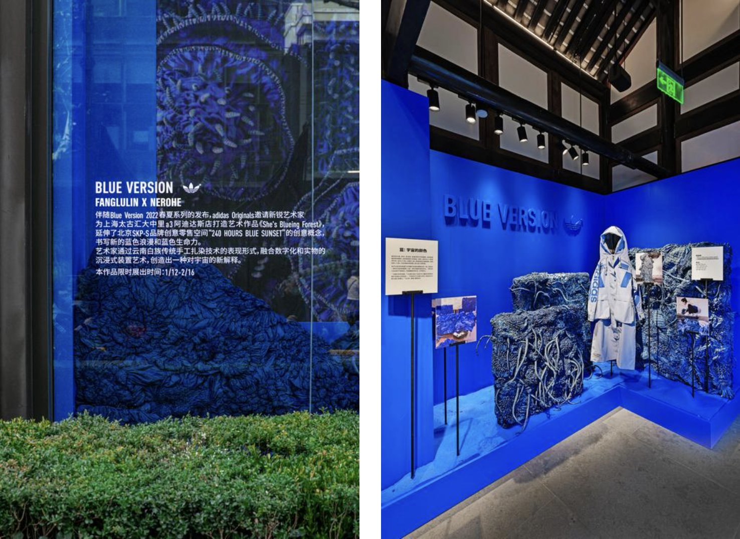 Garden of Phygitality(东京原宿裸眼 3D 曲面屏)、核聚变可视化、虚拟现实、重量模拟、扎染数字解构、bleu(阿迪达斯蓝色campaign)、NFT(非同质化代币)、佳士得 AI 艺术拍卖