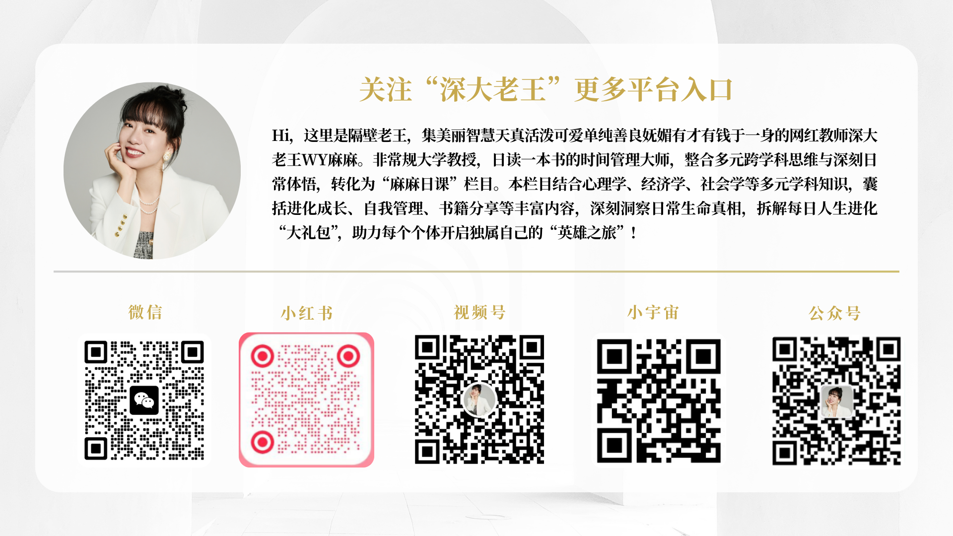 ✨深大老王WY麻麻,非常规大学教授,日读一本书的时间管理大师,整合多元跨学科思维与深刻日常体悟,转化为“麻麻日课”栏目。本栏目结合心理学、经济学、社会学等多元学科知识,囊括进化成长、自我管理、书籍分享等丰富内容,深刻洞察日常生命真相,拆解每日人生进化“大礼包”,助力每个个体开启独属自己的“英雄之旅”!