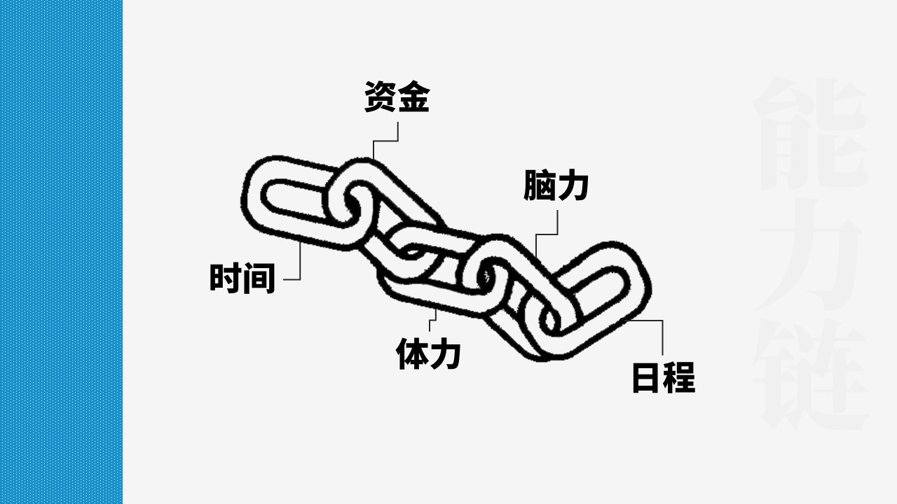 除了动机,还得有能力。如果我很想做一件事,但我的能力根本就做不到,那么我再想做它,也是白搭。福格博士给了我们一条由5个因素组成的能力链条,这五个因素分别是时间、资金、体力、脑力和日程;一件事能不能做到,取决于这其中最弱的环节。比如,还是这个要减肥的孩子,他准备每天跳一套7分钟的健身操。这对他来说,难吗?从时间和日程看,一个人再怎么忙,总是能从一天里找出7分钟的时间来的,所以这两方面对他来说都不难;资金上呢,这套操网上就能免费学,资金为0;接下来就是脑力和体力:脑力吧,这套操很简单,就是摆摆手踢踢腿跳一跳,不难学会;那最后就剩体力了,一套操跳完会不会很累呢?如果跳完刚刚好出点汗,有一点点累,但还能忍受,他可能很容易就能坚持下去;如果跳一次给他累个半死,可想而知,下一次想让他再跳就难了。