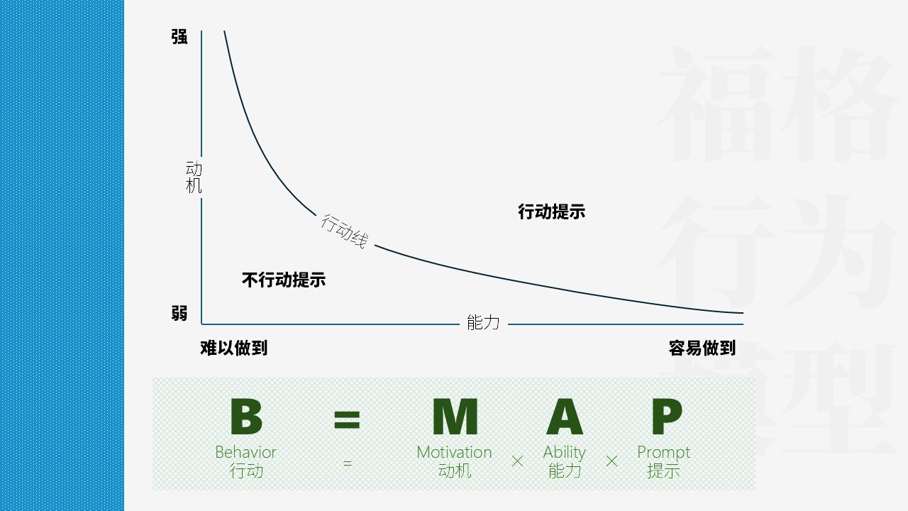最后呢,是提示。这个提示有什么用呢?事实上,这是整个模型中最重要却又最容易被忽视的要素。想想看,你怎么可以让孩子在平常多喝水?喝水这个动机是个人都有,喝水的能力对绝大部分人来说也都不难,孩子为啥还是不太喝水?因为他忘了。只要我们给到他合适的提示,他就有可能能多喝点水。实验证明,只要你在一个人桌子的左手边放上半杯水,大约每天就能让他多喝4杯水。