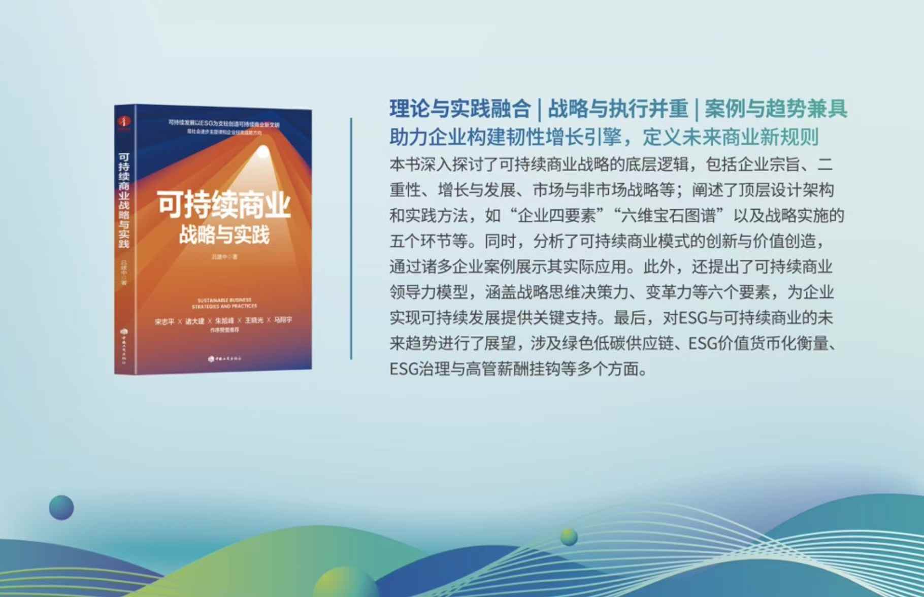 《可持续商业战略与实践》是吕博士近期完成的原创力作,是理论与实践相结合的实操性著作。这本书没有停留在对 ESG 的表面探讨,而是深入挖掘它的本质 —— 可持续商业。