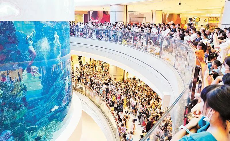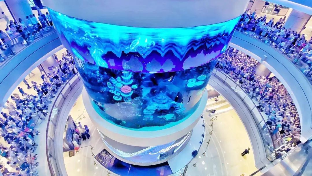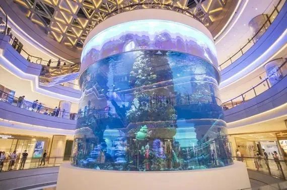 广场B区中庭的海洋馆,也是目前亚洲购物中心室内最大360度全景环绕柱状海洋馆。
