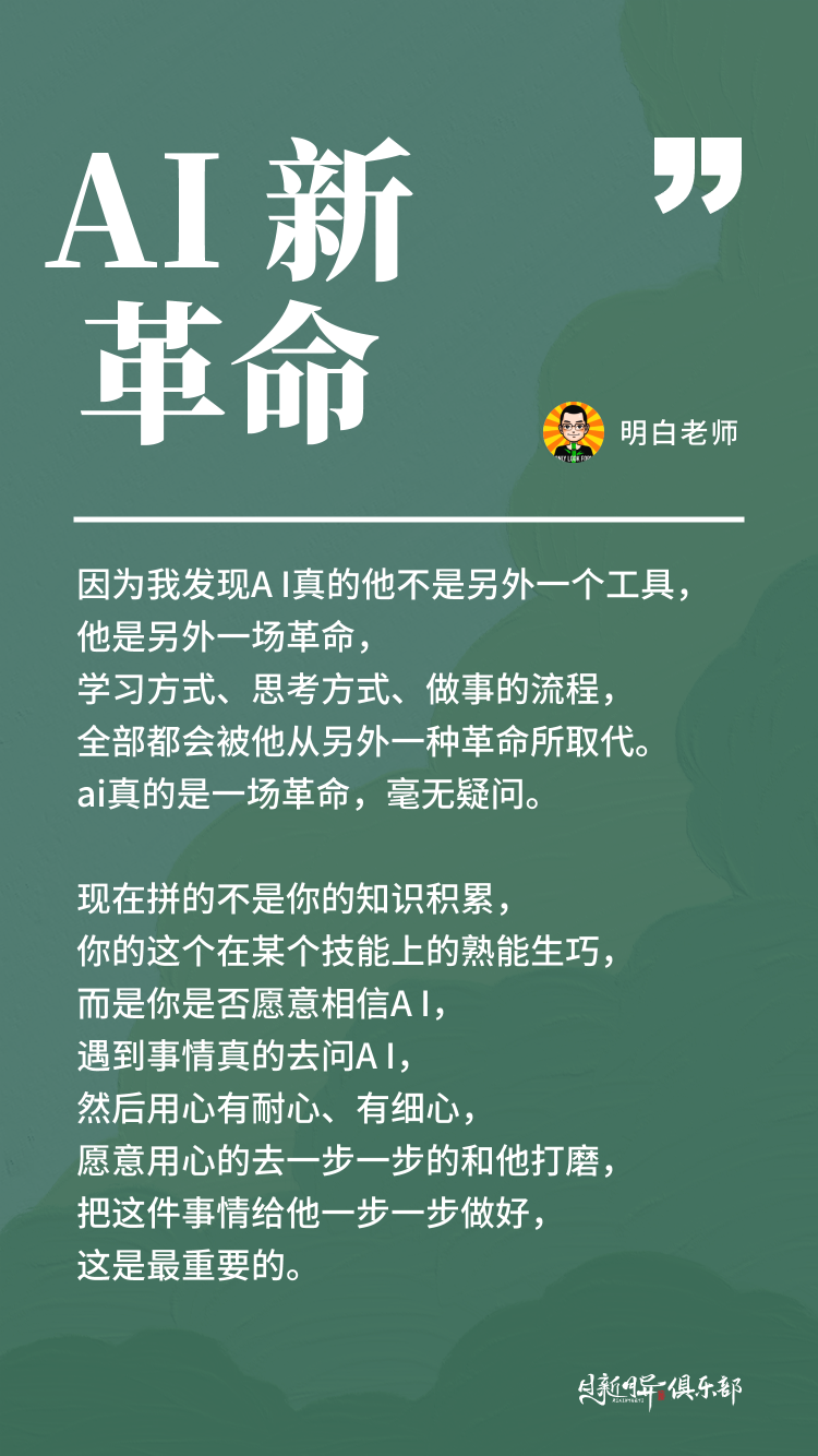 因为我发现A I真的他不是另外一个工具,他是另外一场革命学习方式、思考方式、做事的流程,全部都会被他从另外一种革命所取代。ai真的是一场革命,毫无疑问,现在拼的不是你的知识积累,你的这个在某个技能上的熟能生巧,而是你是否愿意相信A I,遇到事情真的去问A I,然后用心有耐心、有细心,愿意用心的去一步一步的和他打磨,把这件事情给他一步一步做好,这是最重要的。