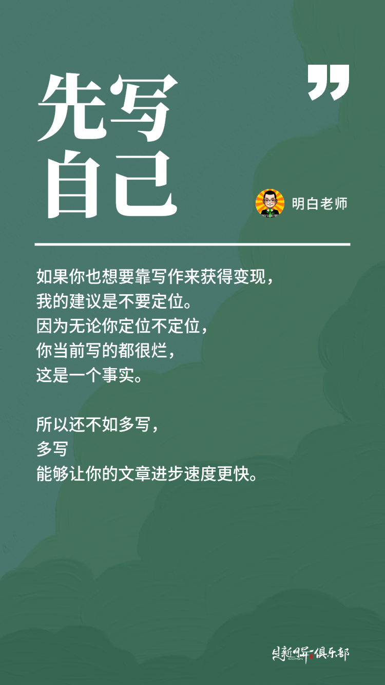 所以如果你也想要靠写作来获得变现,我的建议是不要定位。因为你定位不定位,你当前写的都很烂,这是一个事实,所以还不如多写,多写能够让你的文章进步速度更快。