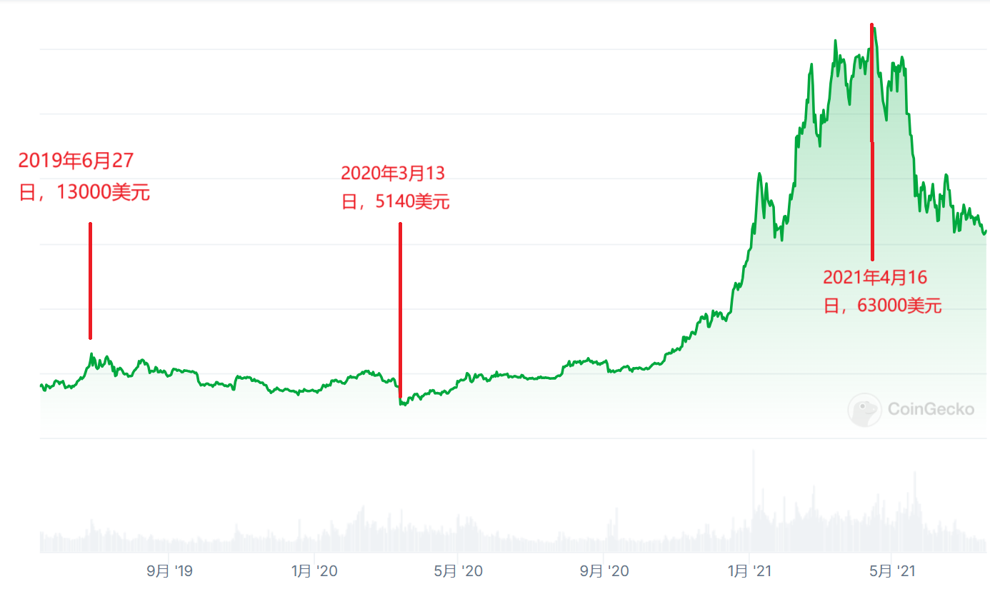 在那一轮熊市中,比特币在2019年6月27日达到了熊市中的峰值13000美元,然后在2020年3月12日当天从7900美元暴跌到3月13日的5140美元。
