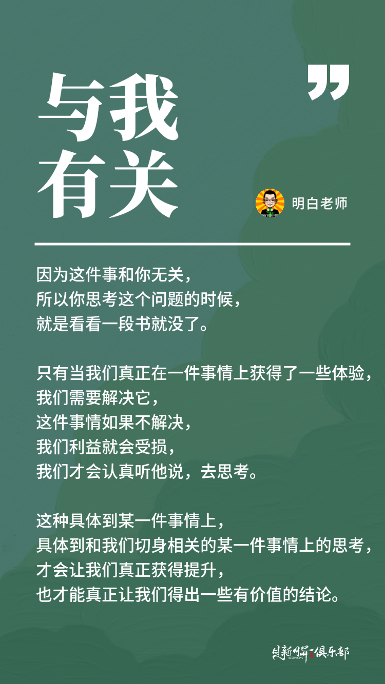 这种具体到事情上,具体到某一件事情上,具体到和我们切身相关的某一件事情上的思考,才会让我们真正获得提升,也才能真正让我们得出一些有价值的结论。
