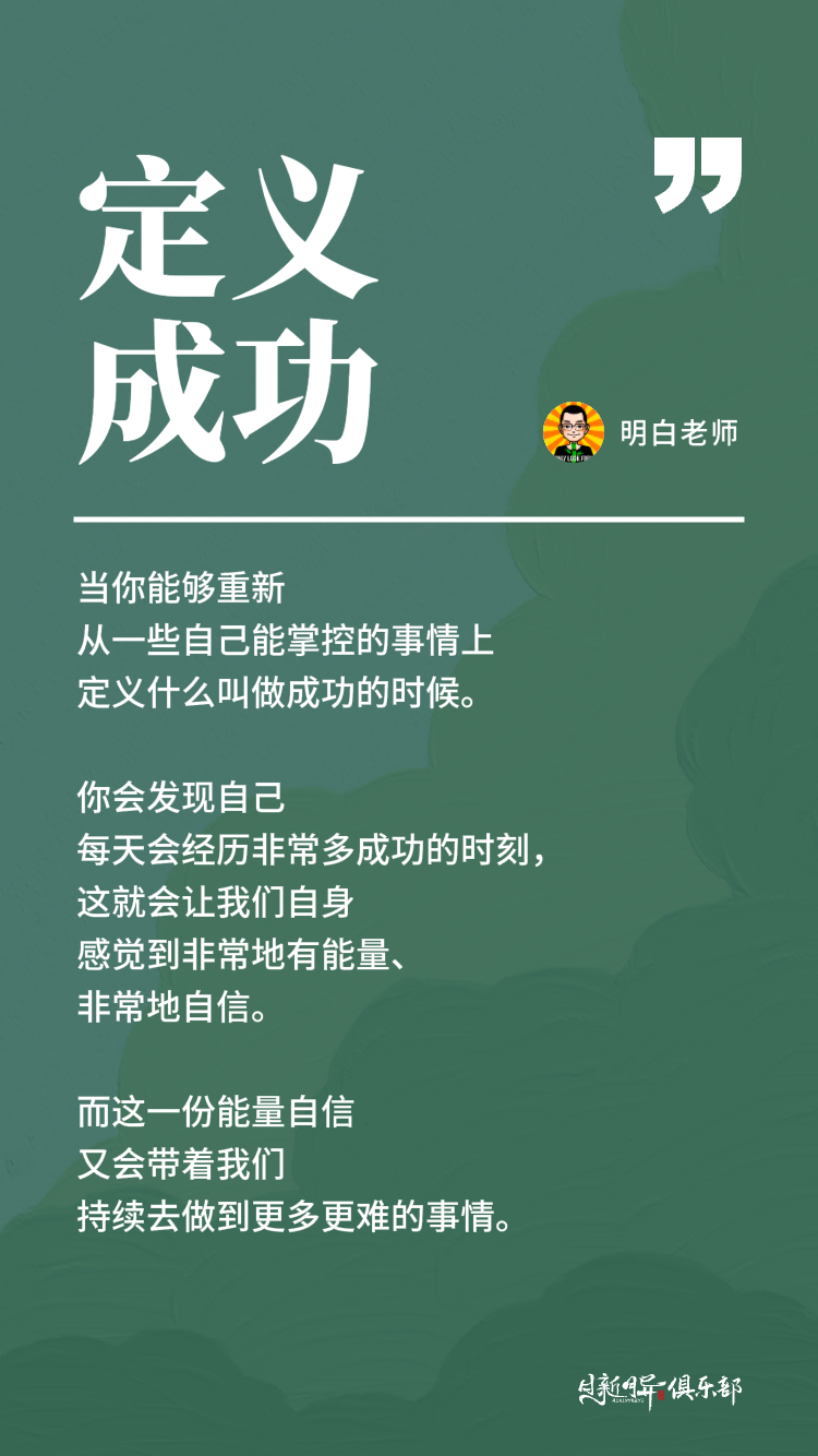 当你能够重新从一些自己能掌控的事情上定义什么叫做成功的时候,你会发现自己每天会经历非常多成功的时刻,这就会让我们自身感觉到非常的有能量,非常的自信。而这一份能量自信又会带着我们持续去做到更多更难的事情,那慢慢的其实我们能够获得的一些客观上的受益,比如工作做的更好、收入变得更高、关系变得更好,身体健康也变得更好,他就会慢慢的出现,我觉得这个非常的重要。