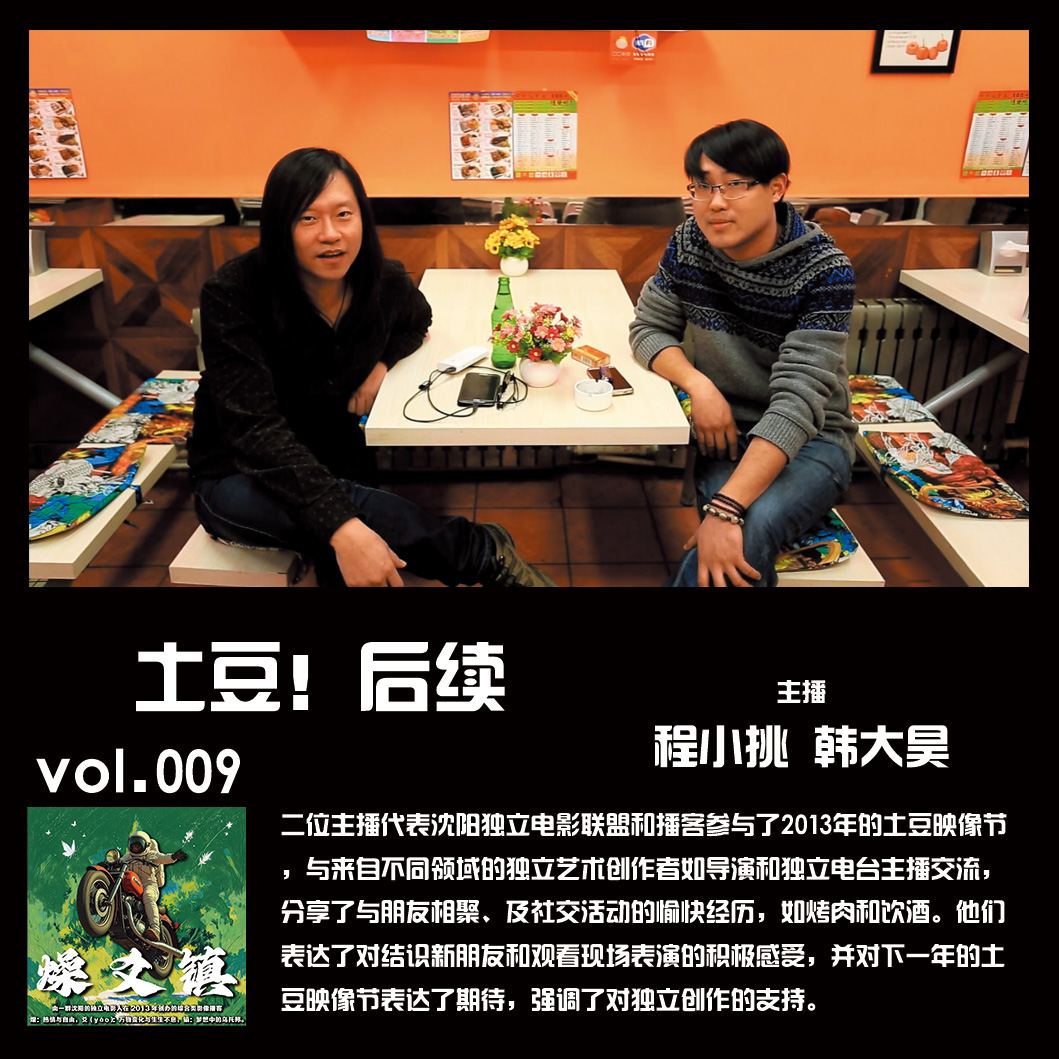 二位主播代表沈阳独立电影联盟和播客参与了2013年的土豆映像节,与来自不同领域的独立艺术创作者如导演和独立电台主播交流,分享了与朋友相聚、及社交活动的愉快经历,如烤肉和饮酒。他们表达了对结识新朋友和观看现场表演的积极感受,并对下一年的土豆映像节表达了期待,强调了对独立创作的支持。