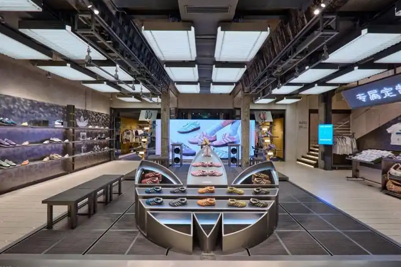 5 月 20 日开业的阿迪达斯三叶草全球旗舰店,揭开了安福路国际化转型的序幕。作为品牌在中国构建的 “金字塔型渠道网络” 顶端门店,其每周上新的产品节奏、限量款首发的稀缺性,吸引年轻消费者蜂拥而至。试运营期间,即便限流,日成交额仍达 5-6 万元。为贴合街区风貌,门店二楼以 “放映厅” 概念设计鞋类陈列区,一楼铺设老上海水门汀地板,用 “复古元素 + 潮流内核” 完成本土化叙事。