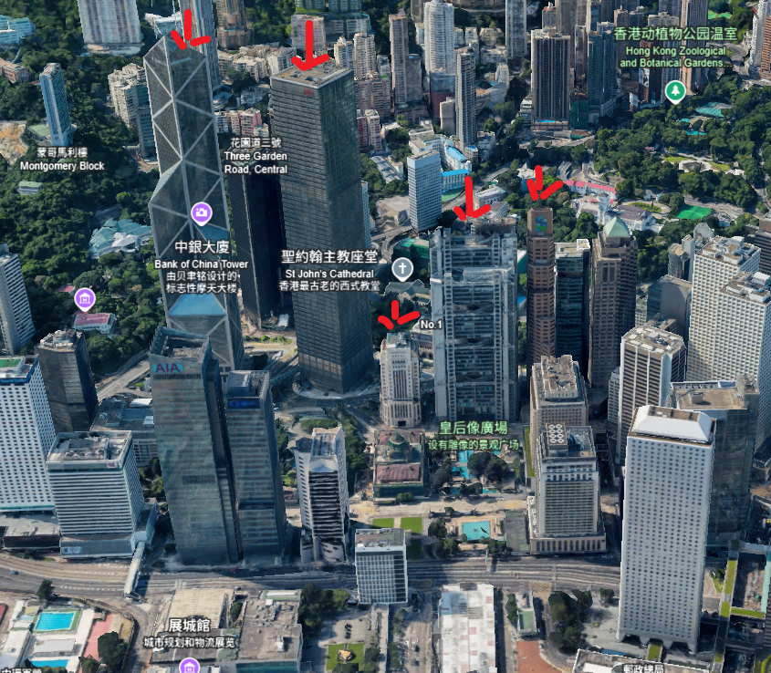 香港GoogleEearth 3D地图(从左到右中银大厦、长江集团中心、旧中银大楼、汇丰银行大楼、渣打银行大楼)