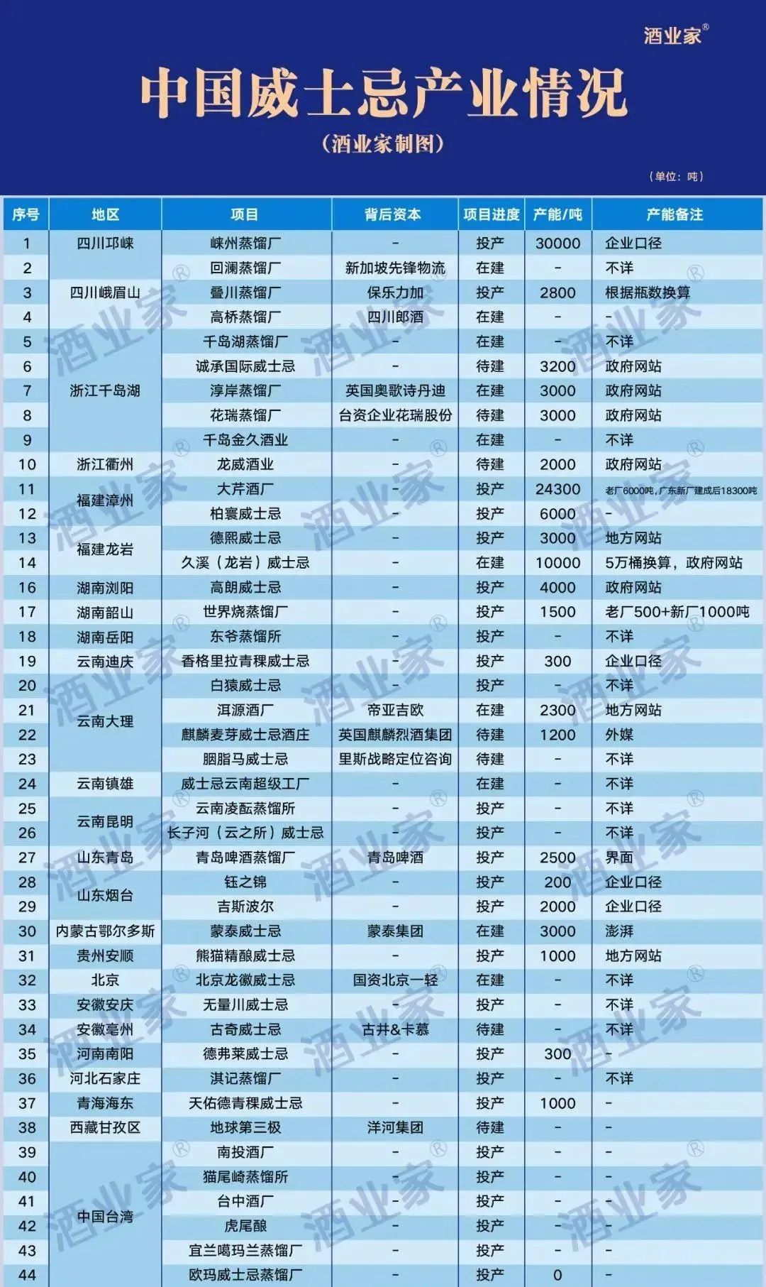 根据《2024中国威士忌产业发展报告》,目前已有45家企业处于在建或投产、待建阶段,其中投产26家、在建10家、待建8家、试运营1家。