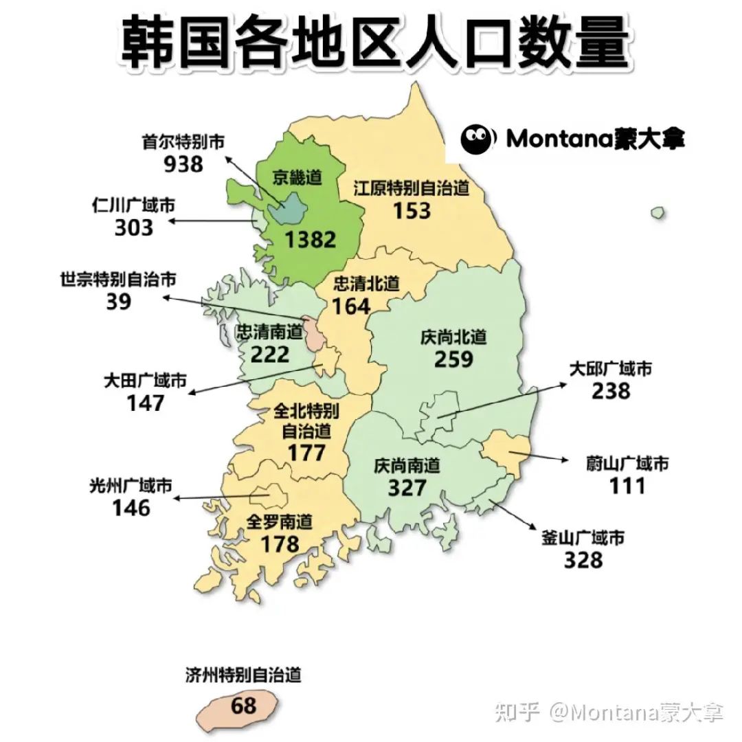 人口分布在韩国很不均匀,人口大多居住在城市,城市化率为82.5%。2015年,包括首尔、仁川和京畿道在内的首都圈人口总计为2514万,占到总人口的49.7%。