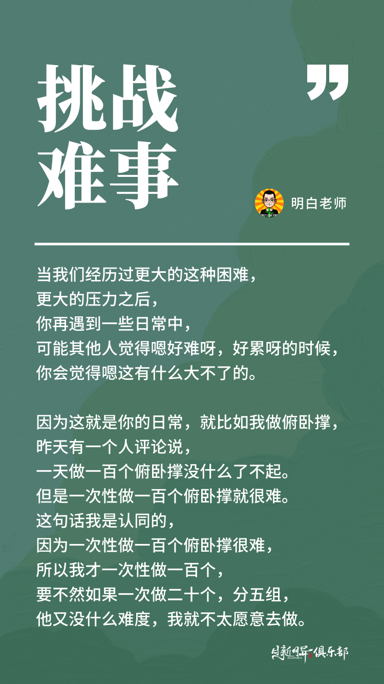 因为这就是你的日常,所以我就觉得……。就比如我做俯卧撑,昨天有一个人评论说,一天做一百个俯卧撑没什么了不起。但是一次性做一百个俯卧撑就很难。这句话我是认同的,因为一次性做一百个俯卧撑很难,所以我才一次性做一百个,要不然如果一次做二十个,分五组,他又没什么难度,我就不太愿意去做。