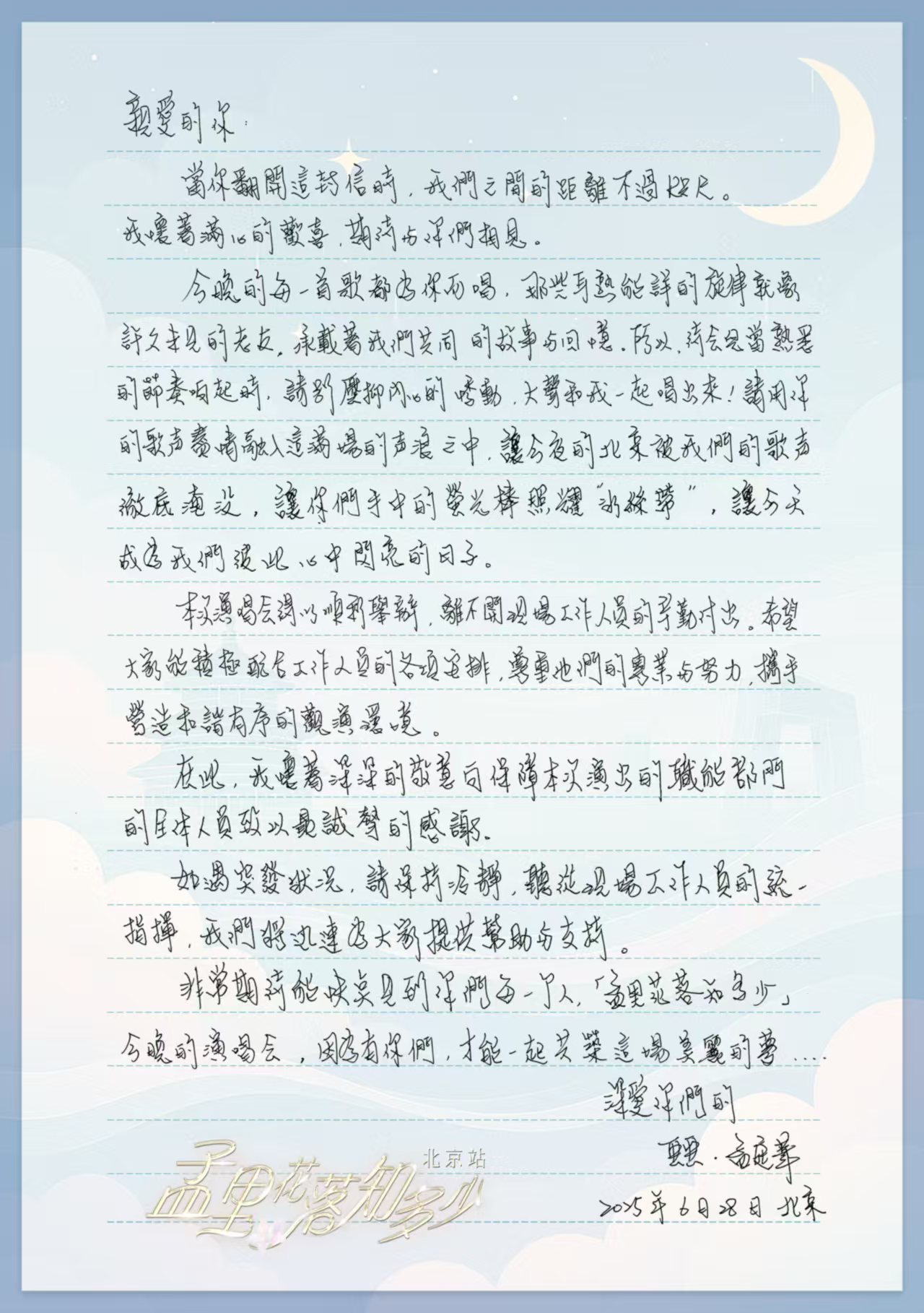 当晚的亚亚,状态非常棒,每唱一首,我们这些第一排的主力,就都在小玲的指挥之下,集体高呼“孟庭苇,我爱你!”,俾使亚亚在短暂的间隙里,感受到现场的热情,获得更多的力量。看着演唱会一步步地成功圆满,乃至惊喜,我也越来越如释重负,也越来越为小玲高兴。惊喜之一,是孟庭苇为这次北京场唱了专属的《旷野寄情》,这首收录在李建复1980年的《龙的传人》专辑里的名作,一下子打通了当天下午与晚上的两个时空。而《旷野寄情》的作者靳铁章老师,这位民歌时代的音乐大师,与亚亚的渊源甚深,一曲《冬季到台北来看雨》,让我们偶遇亚亚,一听就是一生。缘分如此奇妙,十天后的厦门,靳铁章老师与熊美玲老师,有一场难得的演出,我还请朋友代为问候了靳老师。