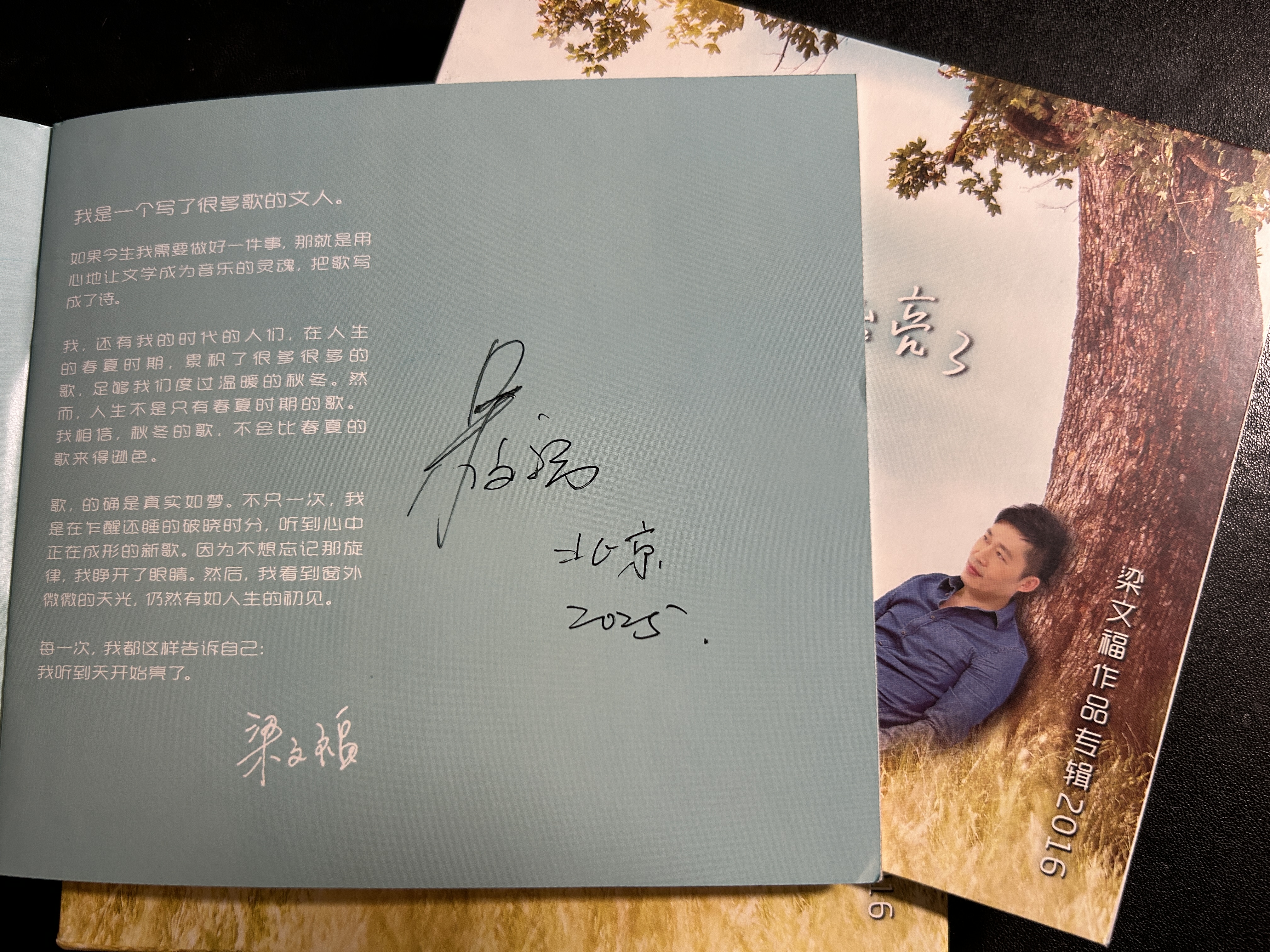 下午的两个多小时,跟小侯老师近在咫尺,齐唱《龙的传人》时,他就在我的正前方不远处,那种时空交错的神奇,铭刻在心。因为要赶赴“冰丝带”,结束后没能请小侯签名,留待来日。到了“冰丝带”,麒导赶紧带我去见梁文福老师,聊了几句,请他签名,边擦汗,边拆十年未拆的唱片,边请梁老师见谅,边跟过来的保安解释,狼狈极了。同时,也看到了梁老师旁边的刘秀美老师,刘老师旁边的刘瑞政老师则未认出来,确认是他之后,我频频回头看去,还想着演唱会结束之后,一定要去问候致敬。结束之前,他们先行离场,非常理解,但也略感遗憾。