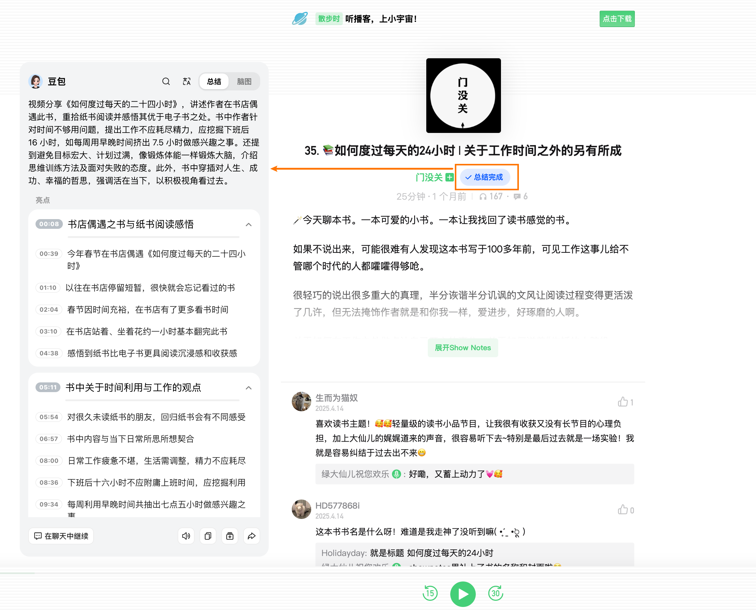 - 豆包也能总结播客,和小宇宙的会员付费总结单集功能差不多