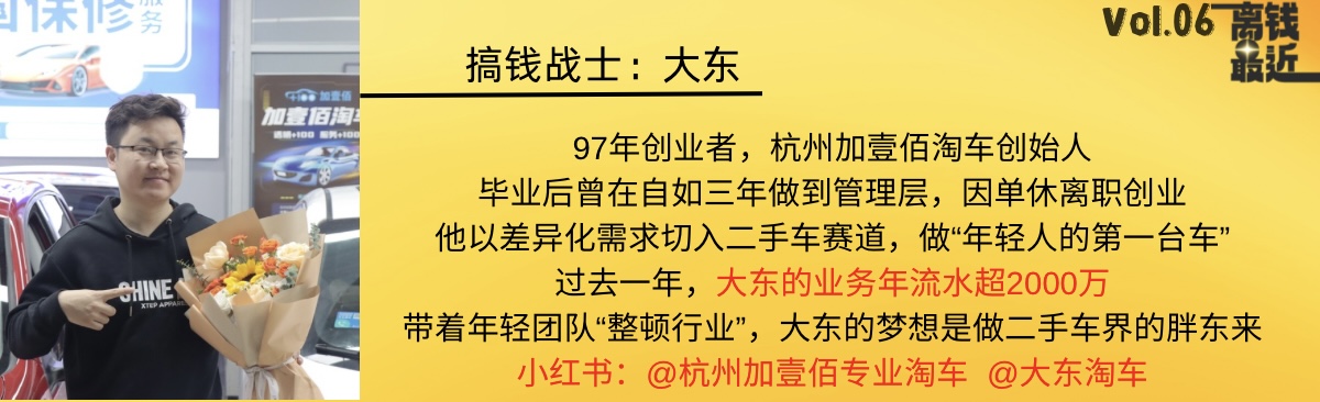 大东,97年创业者,杭州加壹佰淘车创始人。他曾在自如做房产经纪人,毕业三年拿到年薪50万,后来因为单休选择离职创业,以轻资产模式切入二手车赛道。目前,大东的团队全员本科生,几乎所有订单都从线上引流,业务已经进入良性规模增长。大东的梦想是做二手车行业的胖东来。