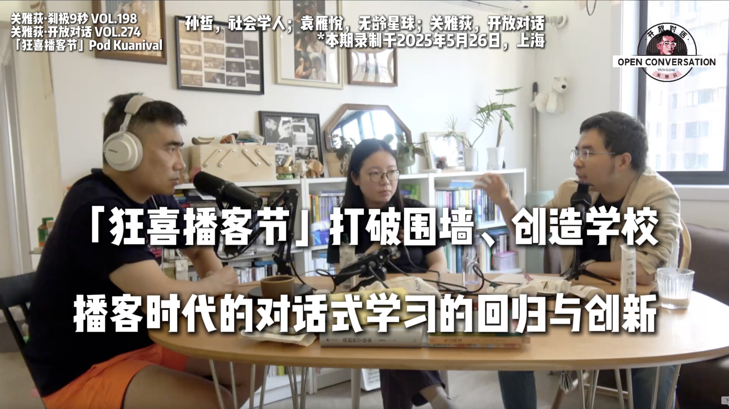 在这期「关雅荻·开放对海」节目中,资深电影人、「狂喜播客节」创始人关雅荻与《社会学人》主播孙哲、《无龄星球》主播袁雁悦展开了一场深度对话,从「狂喜播客节」这一独特文化现象切入,探讨了教育形态、表达自由与社会连接的多重议题。