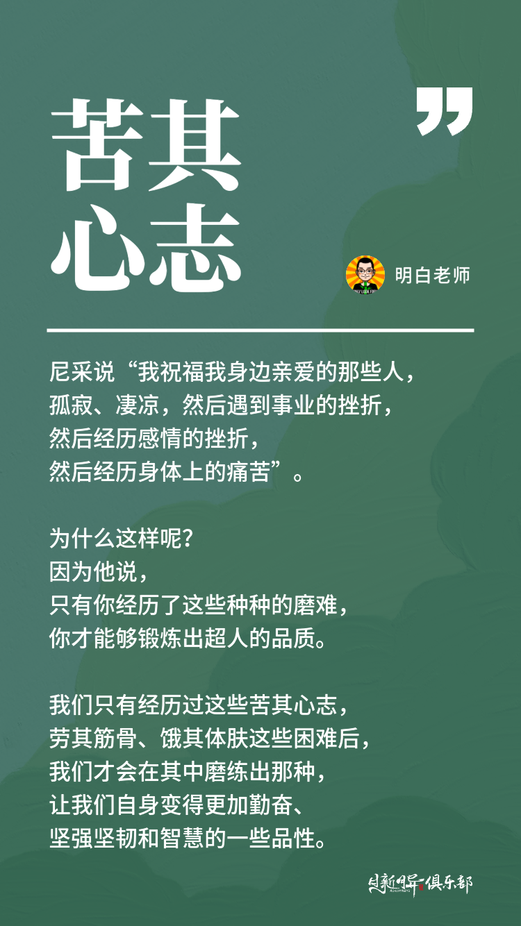 这就和我们中国孟子讲的“天将降大任于斯人,也必先苦其心志,劳其筋骨,饿其体肤,空乏其身,行拂乱其所为,所以动心忍性增益其所不能”一样,就是我们要让自己去承受很多很多。不是承受,而是我们只有经历过这些苦其心志,劳其筋骨、饿其体肤这些困难后,我们才会在其中磨练出那种,让我们自身变得更加勤奋、坚强坚韧和智慧的一些品性。
