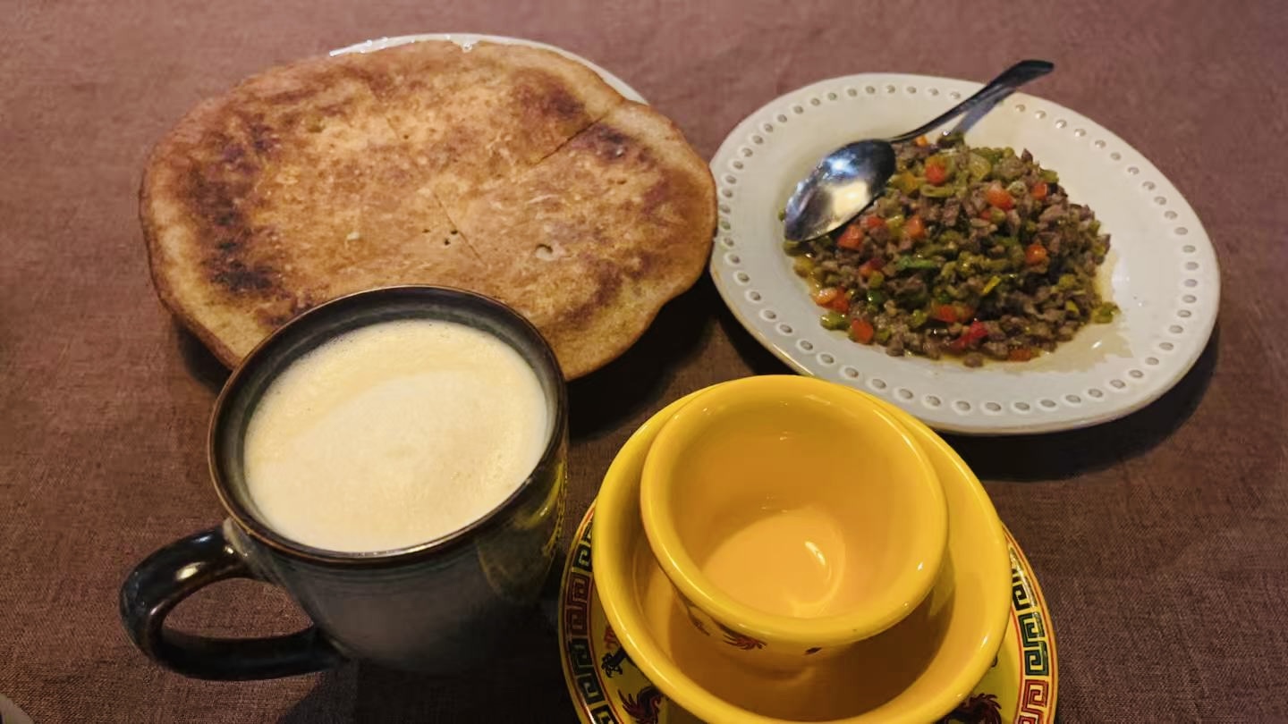 云南常见美食如饵丝、饵块、烤乳扇在香格里拉也能吃到,藏餐是当地特色。一个人点餐难,我点了一份碎牛肉(类似红三剁)、一个青稞饼和一人份酥油茶(加青稞面,过滤后口感细腻)。味道不错,但价格超预算。