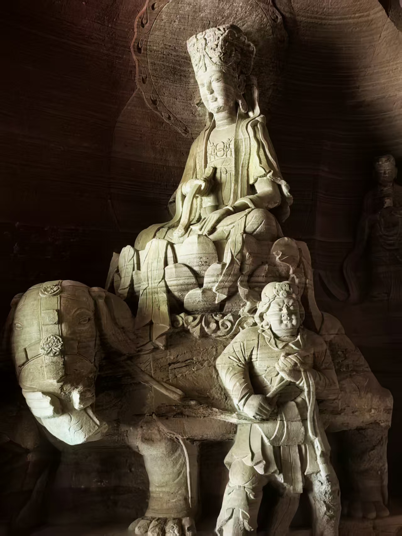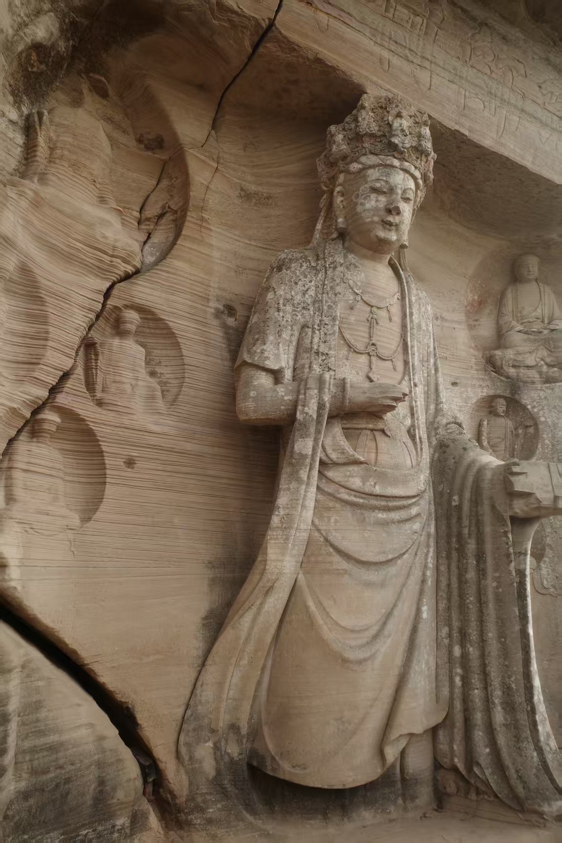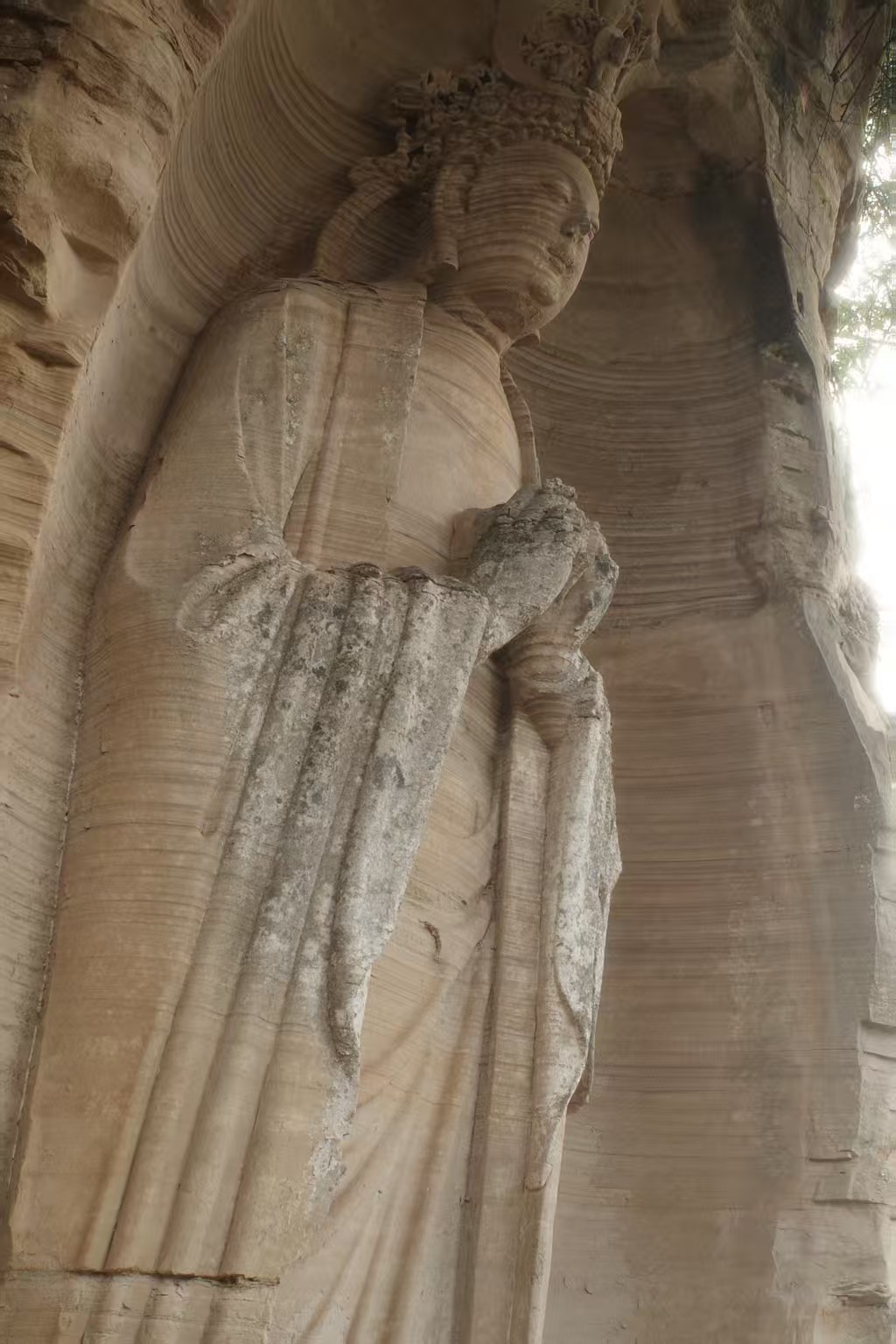 宋代的美是不张扬的,隽永优雅的,如汝瓷般历久弥新:有着“最美水月观音”之称的毗卢洞紫竹水月观音,悬坐于崖壁之上,一腿曲起,一腿下垂,姿态悠然自得。她的衣袖和飘带随风起舞,仿佛下一秒就会轻盈飘落;而茗山寺的石窟,历经千年风沙,让这里的文殊菩萨们拥有了独一无二的美,脸庞上的一道道褶皱是岁月留下的痕迹,看尽世间沧海桑田。