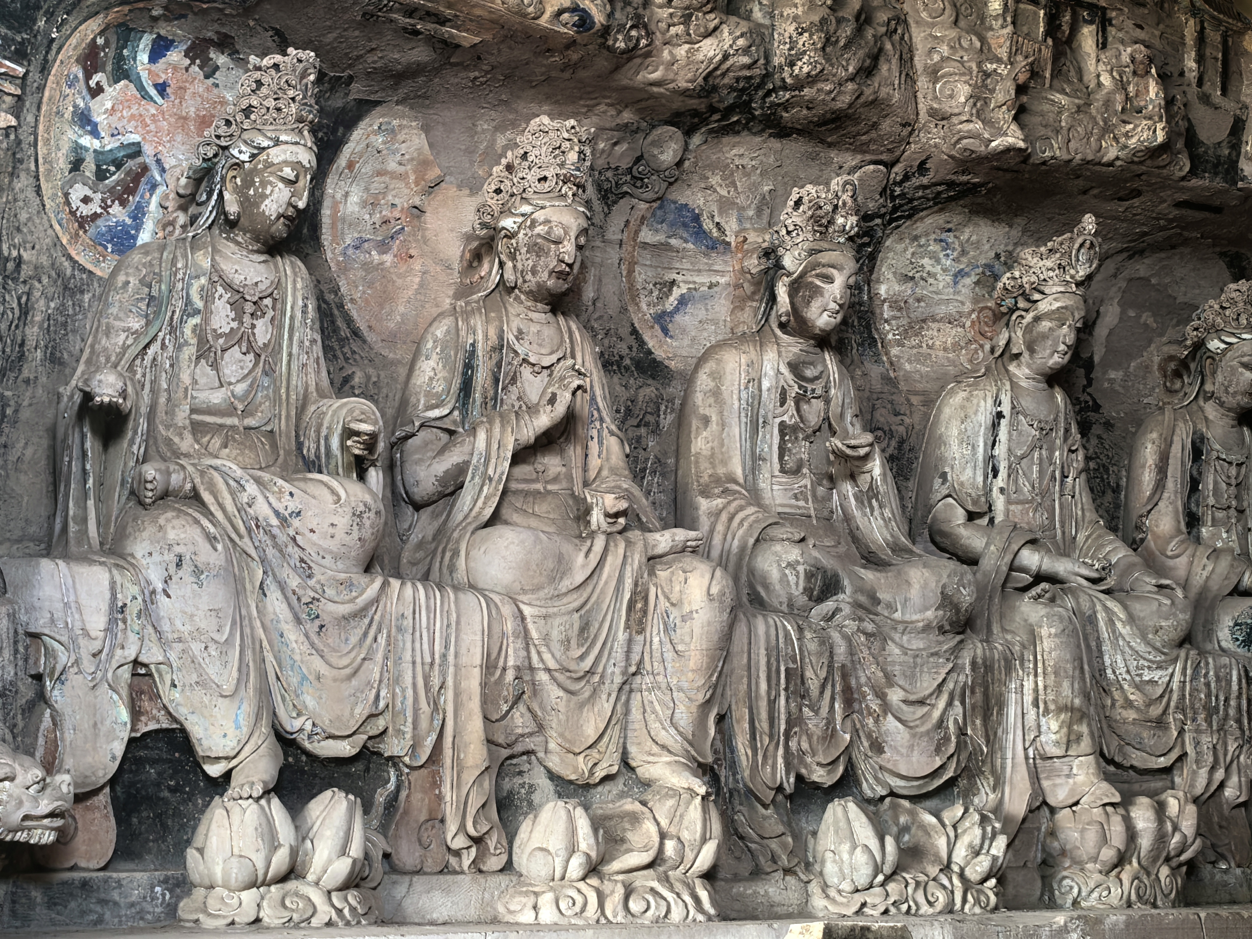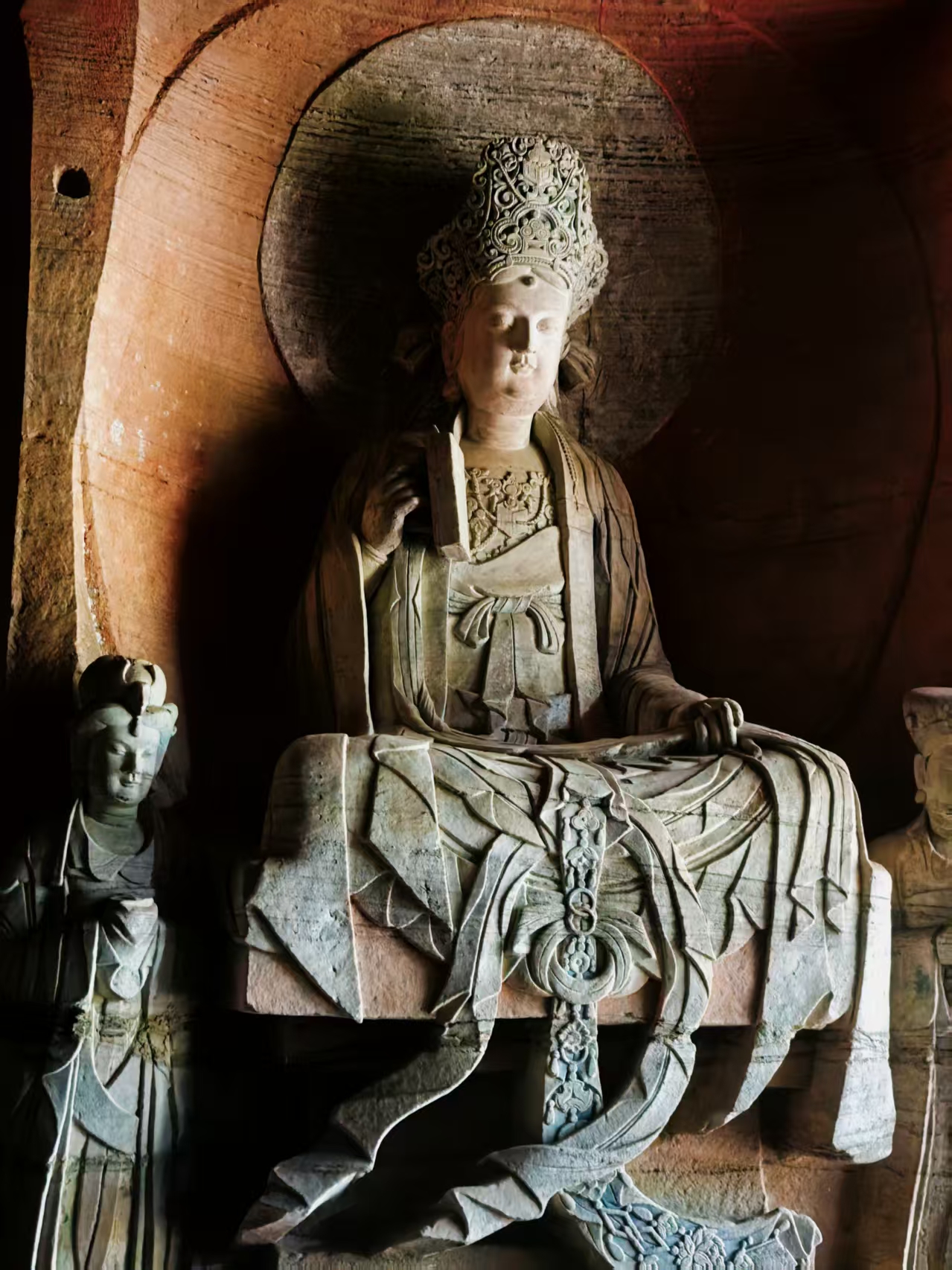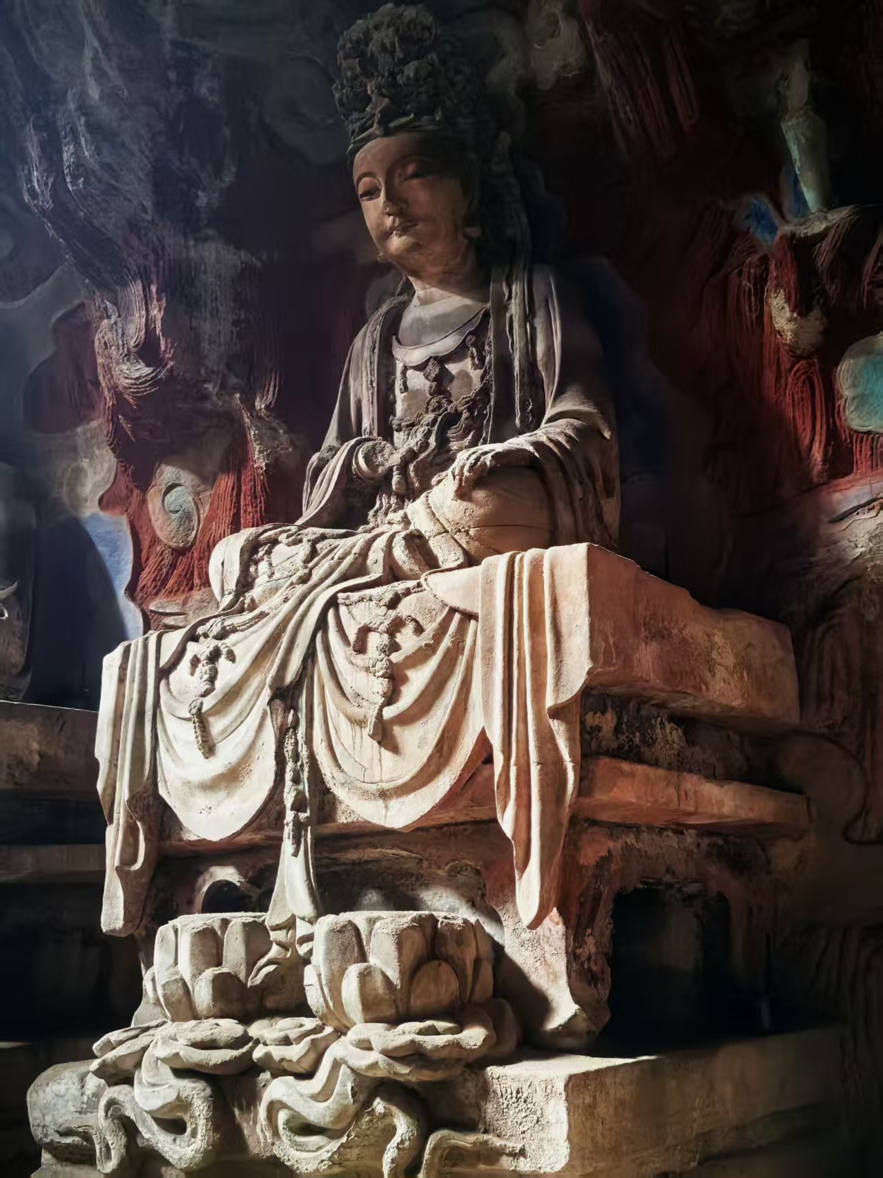 宋代的美是不张扬的,隽永优雅的,如汝瓷般历久弥新:有着“最美水月观音”之称的毗卢洞紫竹水月观音,悬坐于崖壁之上,一腿曲起,一腿下垂,姿态悠然自得。她的衣袖和飘带随风起舞,仿佛下一秒就会轻盈飘落;而茗山寺的石窟,历经千年风沙,让这里的文殊菩萨们拥有了独一无二的美,脸庞上的一道道褶皱是岁月留下的痕迹,看尽世间沧海桑田。